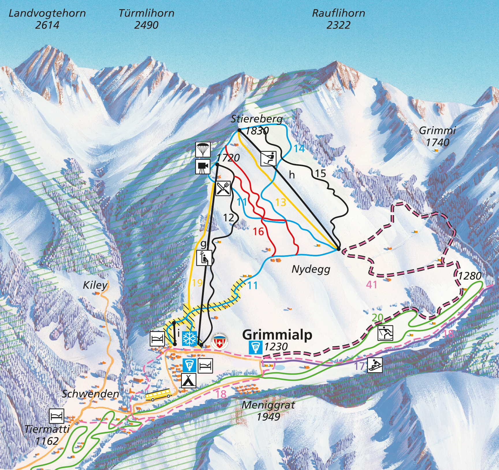 Ganz auf die Familie zugeschnitten ist das Skigebiet Grimmialp in Schwenden. Wer neben Ski- und Snowboardfahren noch etwas anderes erleben möchte, ist hier richtig. Das Gebiet ist sonnig, übersichtlich und abwechslungsreich, genau das, was sich viele Familien wünschen. Zu den Anlagen gehören eine 3er-Sesselbahn mit Einstiegsförderband, ein leistungsstarker Schlepplift und ein privater Kinderlift. Die unteren Pistenbereiche können technisch beschneit werden.
