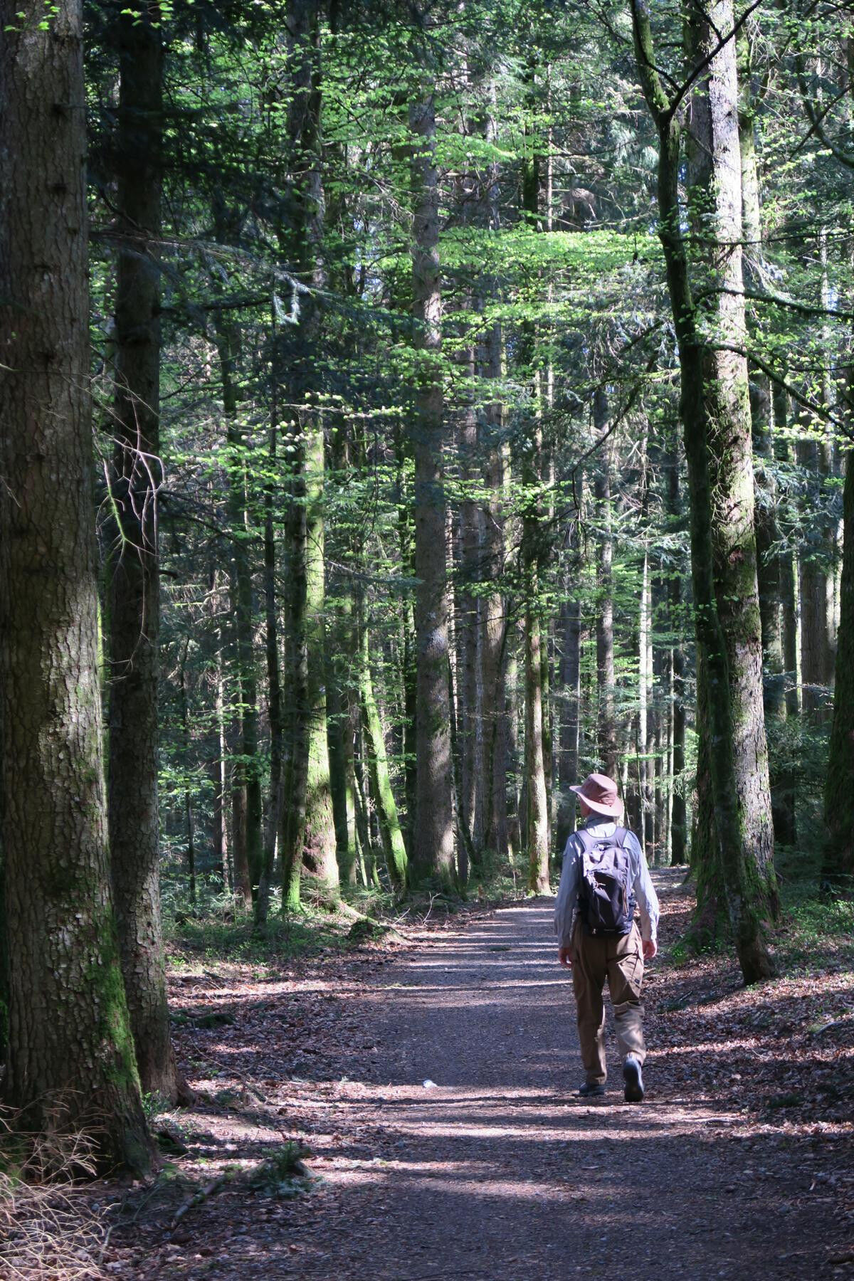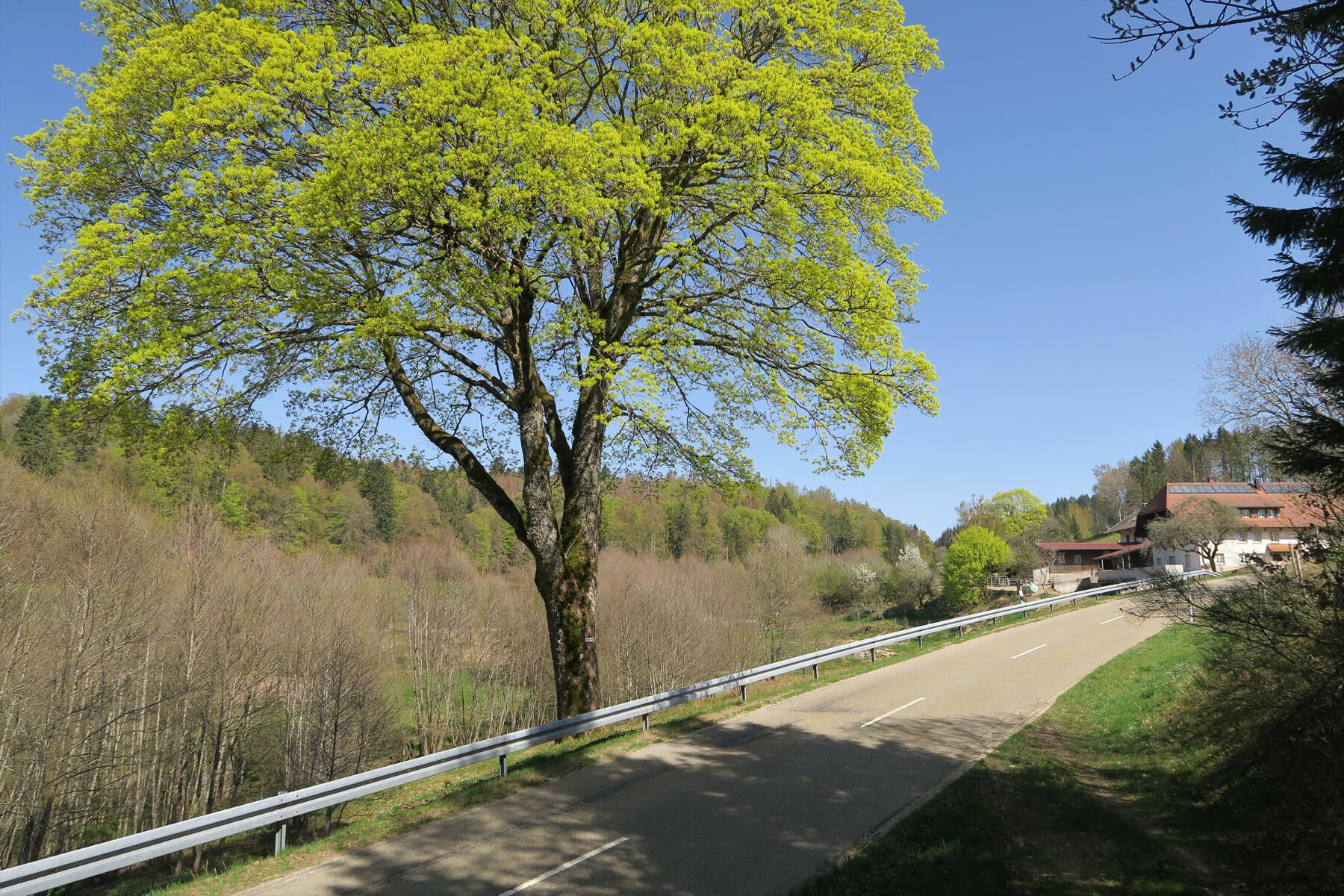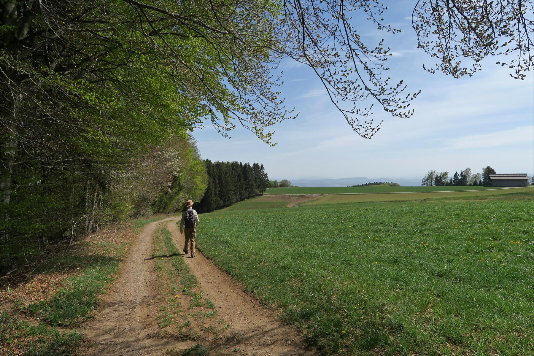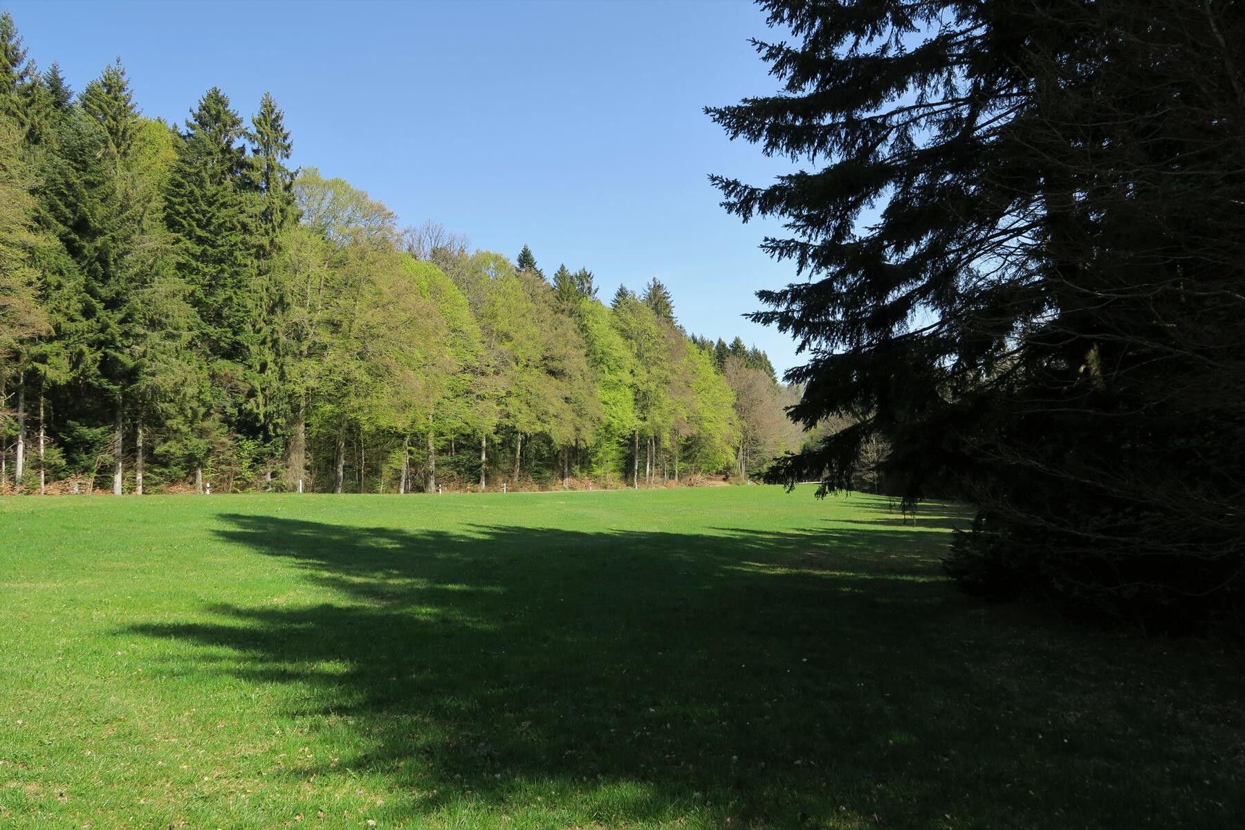 Links abbiegend gelangen wir zum Wegweiser Schwarzwasen und nach links hinauf zum Wegweiser Erzlöcher, 910m, der ebenfalls an den historischen Bergbau erinnert. In der Folge führt uns die Route insgesamt wellig durch den Kirchspielwald, passiert eine kleine Hütte und führt schließlich wieder hinauf zum Igelacker, 930m, wo wir auf den Hotzenwald-Querweg treffen. Seine weiß-schwarze Raute auf gelbem Grund schickt uns nach links, meist aussichtsreich am Waldrand entlang und durch eine herrliche Laubwaldpassage zum Abzweig Rohrbach und schließlich auf breitem Weg zurück zu unserem Ausgangspunkt.