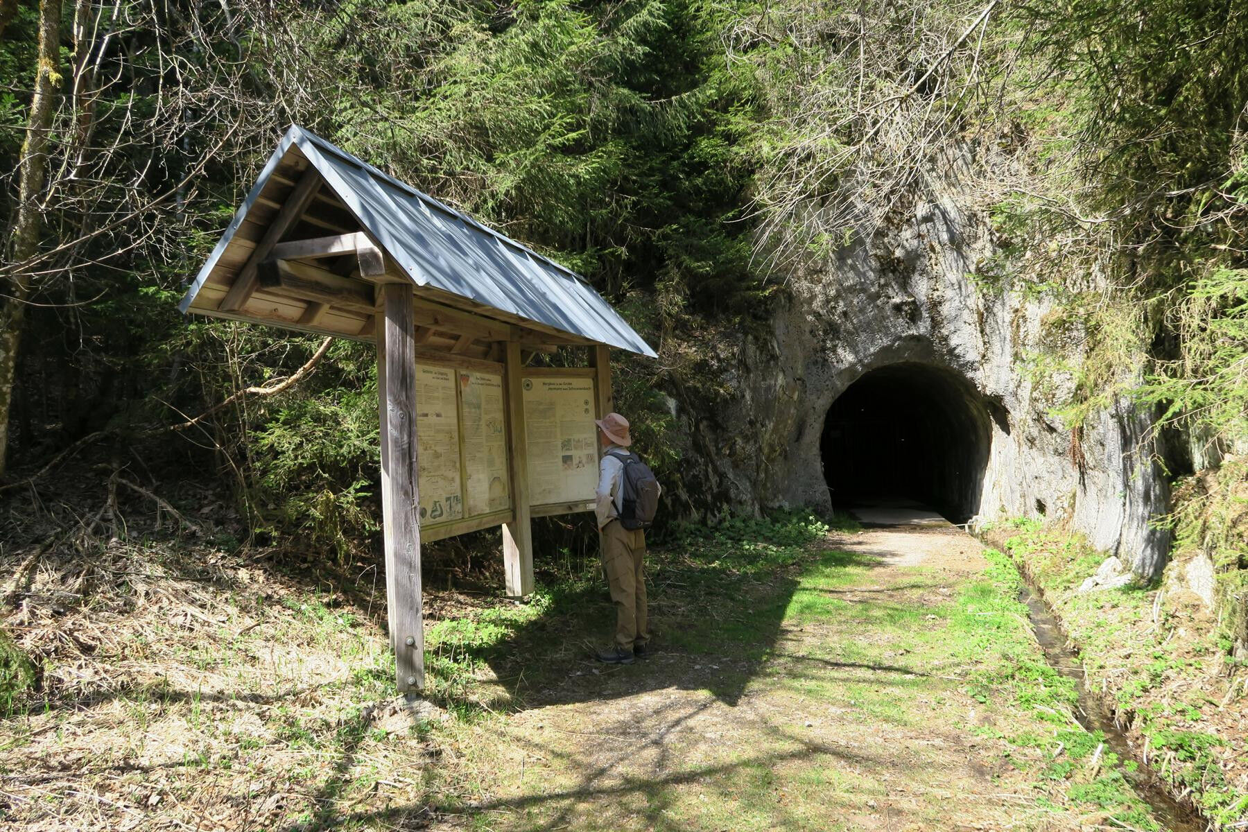 Zunächst passieren wir die Burger Säge, 760m, wo wir abermals auf die gelbe Raute wechseln. Bald geht der Forstweg in eine Straße über, die wie auch die folgende jedoch wenig bis kaum befahren ist und den Wandergenuss daher nicht merklich trübt. Auf der linken Straßenseite können wir uns beim Hermannstollen über die Hotzenwälder Bergbaugeschichte informieren. Nur wenige Minuten später führt rechter Hand ein kleiner Pfad zum Wasserfall unterhalb des Krai-Woog-Gumpens. Hier laden einige Bänke zu einer ausgiebigen Rast ein, zudem besteht die Möglichkeit für alle Zwei- und Vierbeiner für eine Abkühlung im Wasser. Der eigentliche Gumpen befindet sich wenige Meter oberhalb und ist über einen steinig-wurzeligen Pfad zu erreichen. Dieser führt auch zur Infotafel an der Straße zurück, auf der wir den Weg zur Schwarzen Säge, 873m, fortsetzen.