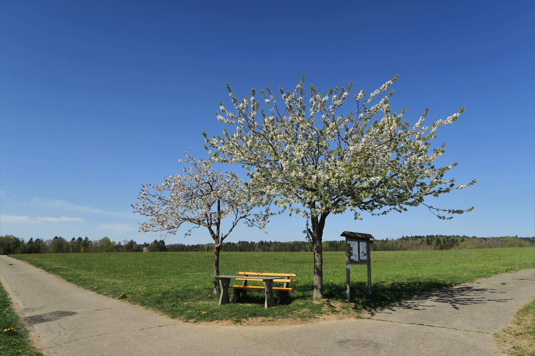 Wir wechseln die Farbe im Wanderzeichen von blau auf gelb und steigen nach rechts auf eine aussichtsreiche Kuppe und noch etwas weiter zu einer Panoramasitzbank. Nun nach links und knapp 200m weiter wiederum links abbiegen. Wir verlassen hier für einen kurzen Abschnitt die Rauten Markierung, um den Ortsteil Hartschwand oberhalb zu umgehen. Bei einer weiteren Sitzbank überqueren wir eine kleine Straße, halten uns weiter immer konsequent geradeaus, passieren einige Wohnhäuser und gelangen so zum nördlichen Ortsende von Hartschwand. Hier treffen sich zahlreiche Wege bei einem Kreuz, auch sehen wir auf der rechten Seite die blaue Raute wieder, der wir nun über ein kleines Sträßlein talwärts folgen.