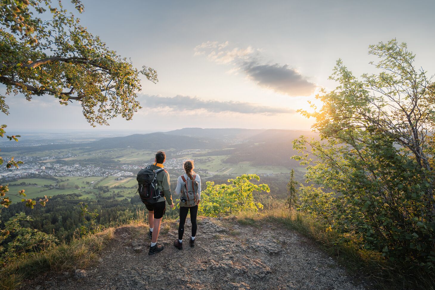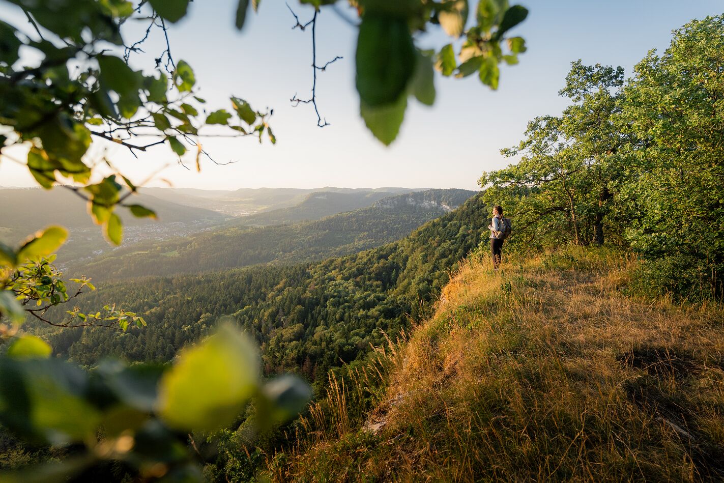 Denn anschließend geht es bergauf. Knackig steigt der Weg unter alten Buchen und Tannen an und passiert den „Hohlen Backofen“ – eine Kalksteinhöhle, wie sie typisch ist für die Alb. Oben belohnt die Hochfläche die „Kraxler“ mit einer grandiosen Aussicht. Südwärts reihen sich bei guter Sicht die Alpen am Horizont auf, im Westen erhebt sich bisweilen der Feldberg, der höchste Gipfel Baden-Württembergs.