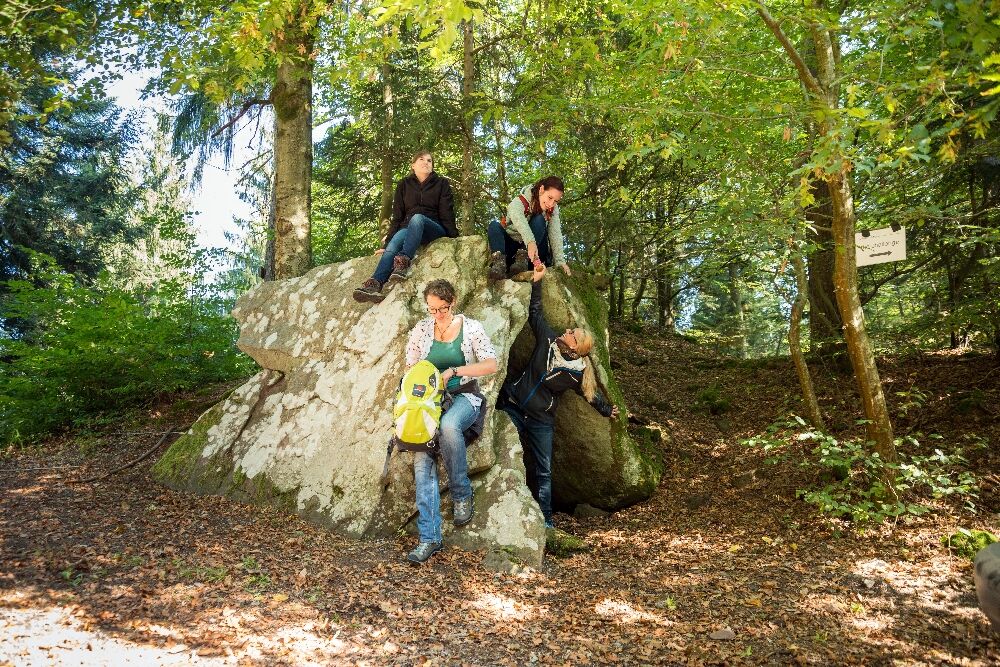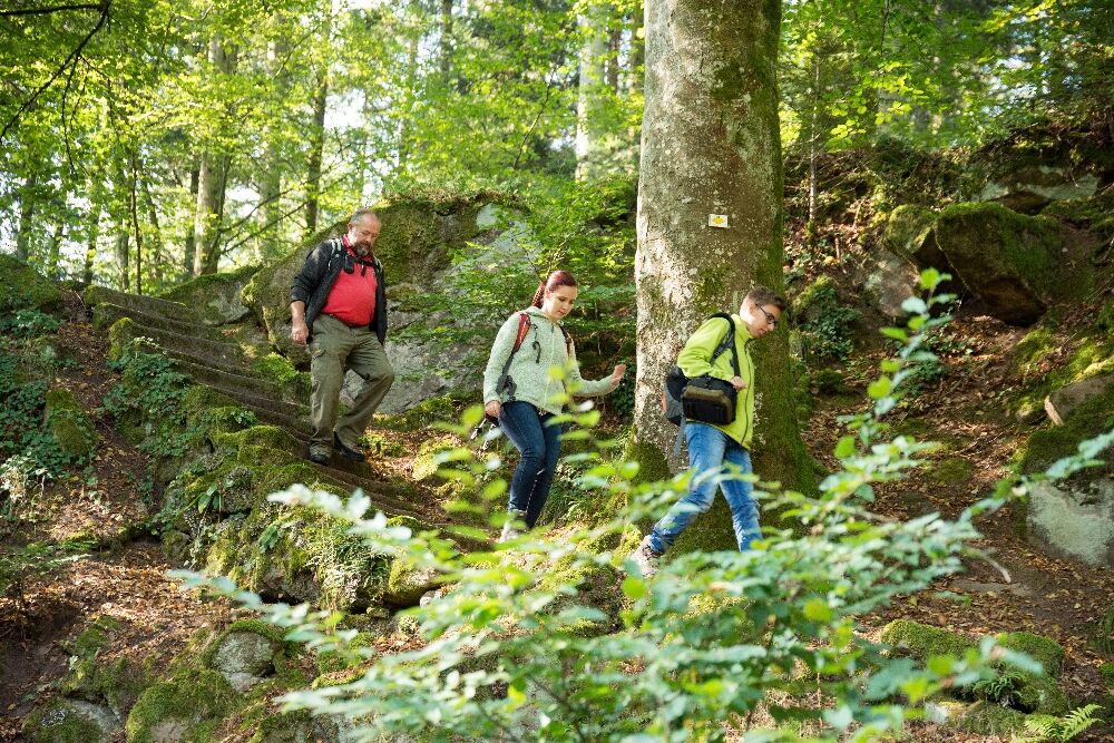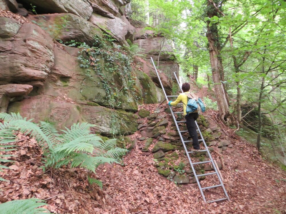 Finally, we manage to detach ourselves and walk down happily. After crossing the K4302, we enter the shady forest, keep left, and soon reach a magnificent forest clearing. At the Hirschloch signpost location, we leave the Gäurandweg and now follow the blue lozenge. Suddenly, a left turn appears before us and opens alpine-like terrain (surefootedness required). The narrow path leads downhill over ladders, mossy stone steps, and gnarly roots along towering rock formations. A truly impressive and memorable section, making our hiking and adventure hearts beat faster!