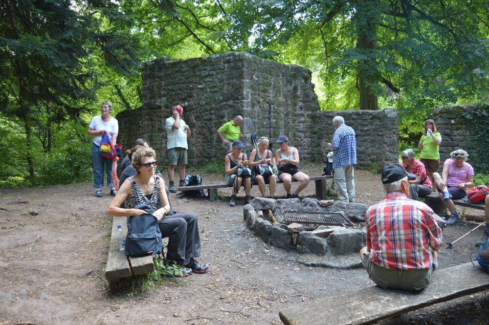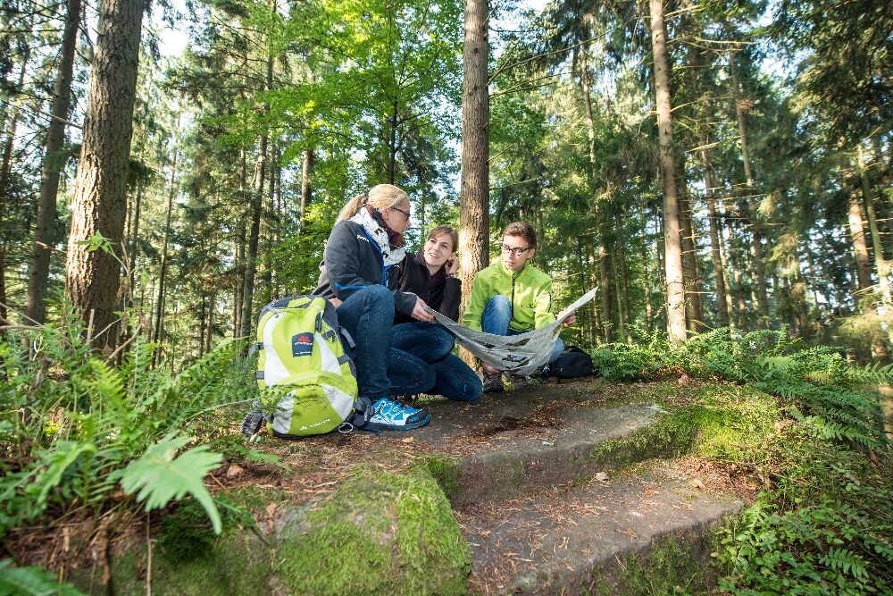 Afterwards, we climb the stone steps on the right side of the ruins and continue hiking along a ridgeline, passing a kind of rock pulpit. Then we descend and pass the resting place Geigerles Lotterbett, where there is also a barbecue area. Under two sandstone rocks, the musician Geigerle is said to have once created a sleeping chamber. It is indeed a very cozy spot! However, we should not lie down as we don't know if we'll want to continue hiking later. That would be a shame, as more beautiful trail sections await us.