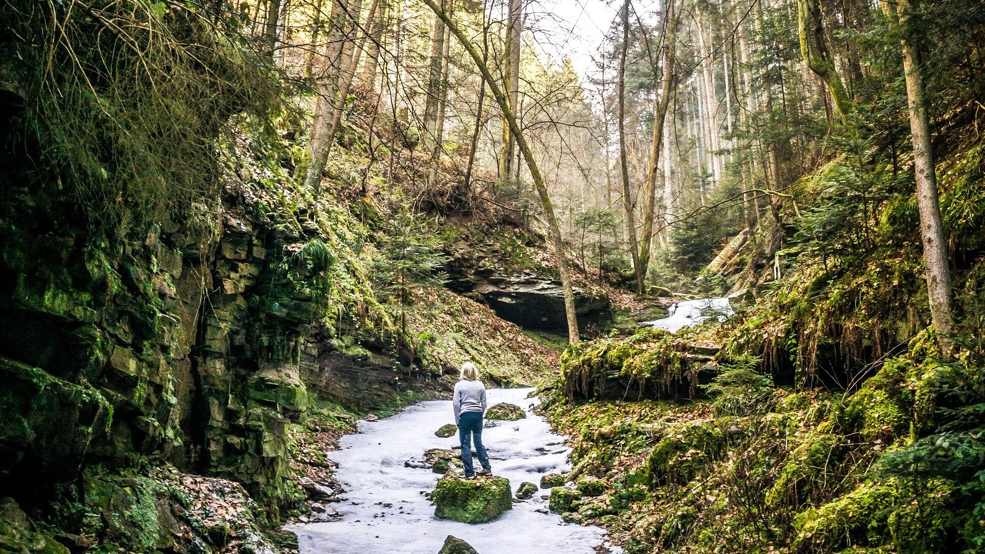 We hike through the gorge called the Xanderklinge, a brook cut into the sandstone. A footpath leads us through this natural phenomenon, and we can hardly keep our eyes on the trail, so fascinated and captivated are we by the gorge's beauty. We pass towering rocks, switch sides of the brook over stones, and climb over roots, rock edges, and deadwood uphill. A soothing silence surrounds us. Soon, an almost inconspicuous, steep path branches off to the left. But we want to ignore it for now, as the trail continues a few meters deeper into the gorge. At a small waterfall (sign "Secluded World"), however, the path finally ends and demands a return (!!! do not continue, as this is a forest biotope - nature protection!!!, there is also high accident risk in the gorge, especially due to falling rocks, stones, trees, deadwood, and flooding during and after heavy rain, so return until the ascent opposite the sign Small Climate). We ascend the alpine-like path uphill and then turn right. A viewing platform invites us once more to look into the breathtaking gorge.