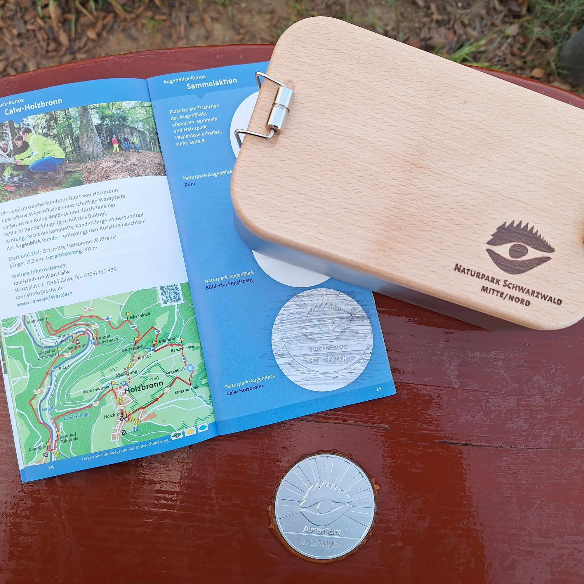 New is a plaque embedded at the seat of the Naturpark-AugenBlick, which you can trace. What is it about? There are 31 Naturpark-AugenBlicke in the Naturpark Schwarzwald Mitte/Nord. Each also has a plaque. This way, you can gradually visit the AugenBlicke and trace the different plaques. The best way is with the new brochure about all AugenBlicke, which provides spaces for this. The current brochure with all 26 AugenBlick routes is available free of charge at the Calw tourist information or conveniently delivered to your home via www.calw.de/Prospekte. If you have visited and documented ten AugenBlicke, a great reward awaits you in the form of a snack box (also available in the souvenir shop of the tourist information).