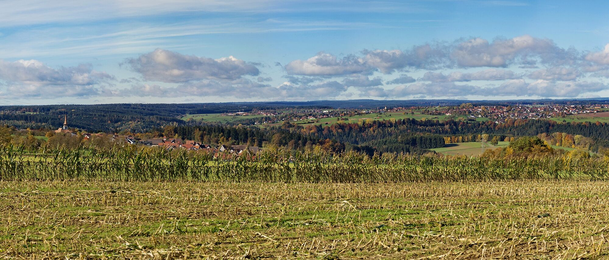 At the beginning, the yellow lozenge points the way and leads us out of the village. Immediately on the left, a fantastic view opens over lush meadows onto the valleys and the gently rolling Black Forest hills. Pause briefly and enjoy before continuing. What a delight!