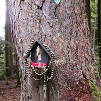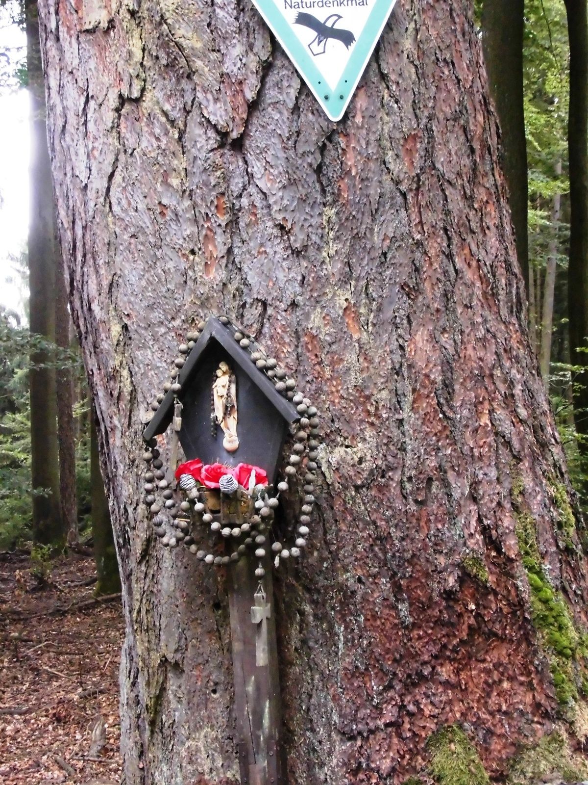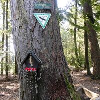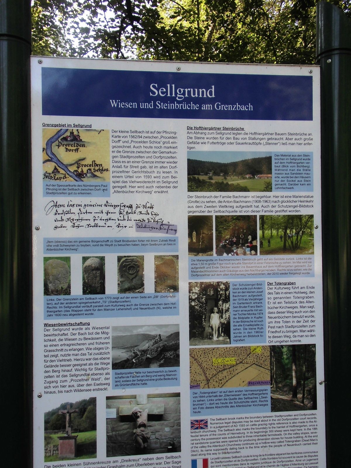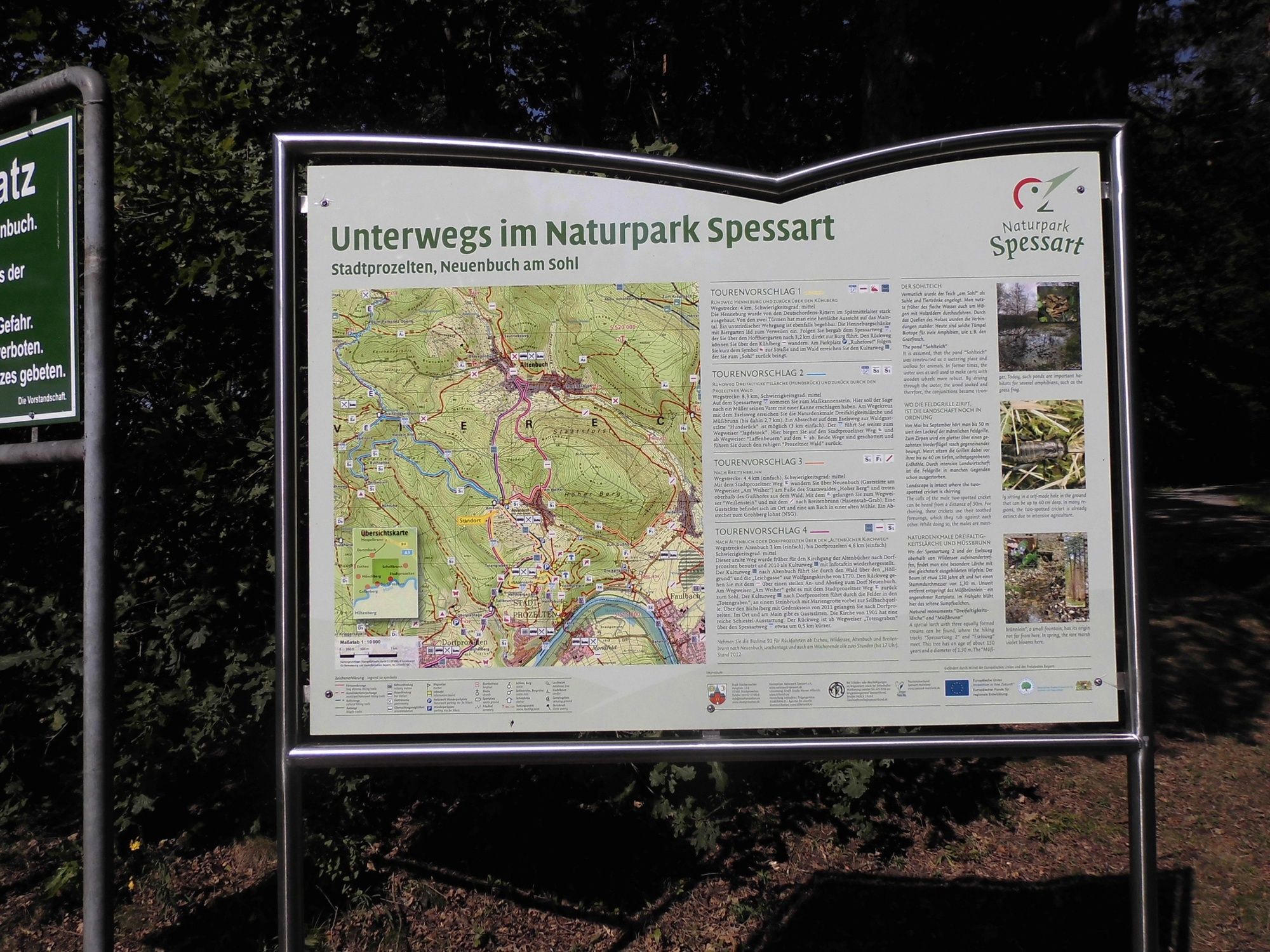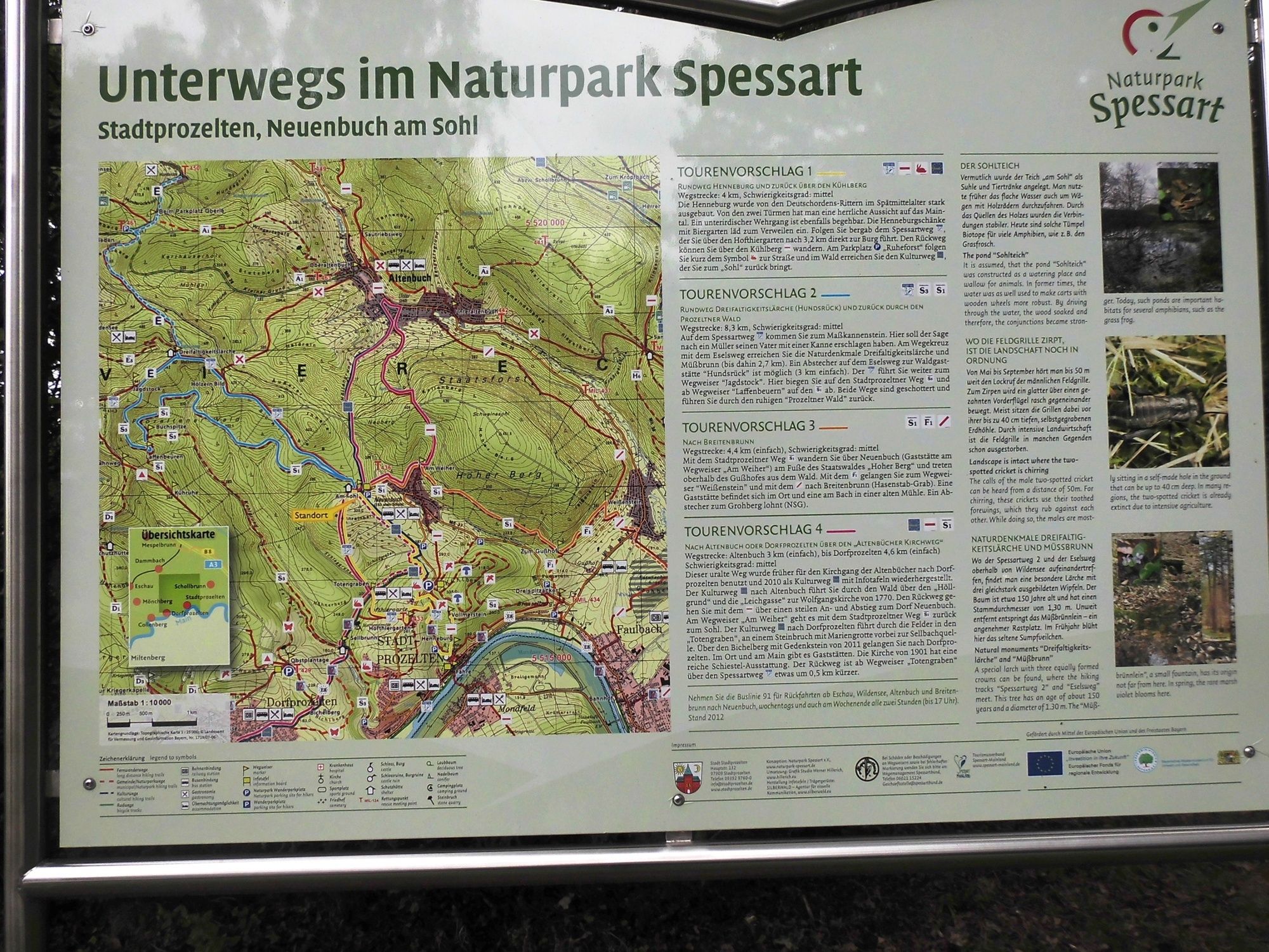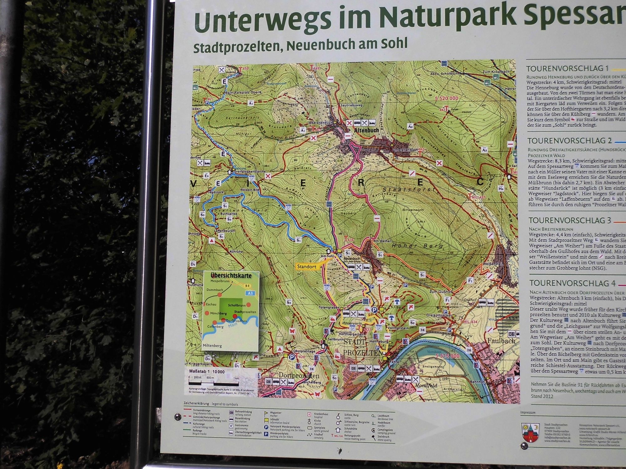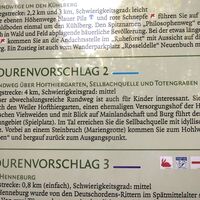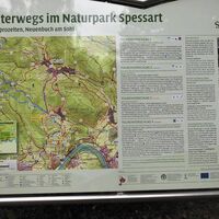Starting from the information board of the Spessart Nature Park at the Ruheforst parking lot, the path continues immediately after crossing the local connecting road Stadtprozelten–Neuenbuch to the right, until after a small clearing the "Altenbucher Kirchweg" branches off with our path to the left through the "Totengraben." After crossing the Totengraben, we reach a signpost "Totengraben" and the path continues towards Dorfprozelten. At this point, we also cross the "Spessartweg 2" and after about 700 meters reach the Sellbrunn signpost with the rest and barbecue area "Sellgrund," which is also the lowest point of our hike. Then continue about 100 meters together with S3 to the left, where we then turn left again, always slightly uphill towards a playground, which we see to the right of the path after leaving the forest. Now we walk briefly between houses until we reach the local connecting road Stadtprozelten - Neuenbuch, which is crossed directly to continue to Hofthiergarten. On this section of the path, there is a wide view over the Main valley and backwards towards the Odenwald with Boxtal and part of the fields of Rauenberg. In Hofthiergarten, there is currently only a place to refresh yourself on weekends. Upon reaching the Hofthiergarten signpost, we turn right and go together with Spessartweg 2, the Franconian Mary’s Way, and the European long-distance trail 8 on the paved road uphill about 150 meters until the path turns right again and leads through a cattle pasture. We stay here until the next fork in the path and then leave the path to the left back to our starting point.