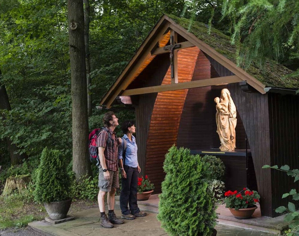 Die „Haberstalrunde“ führt Sie nun weiter bis zur kleinen Bocksbergkapelle. Von hier aus folgen Sie der Wegmarkierung 11 nach links. Hinter der Schutzhütte biegen Sie nach rechts ab. Der Weg bringt Sie ins Obere Haberstal und wechselt dort auf einen schmalen Fußpfad, der Sie jetzt ein Stück begleitet. Die unterschiedlichen Waldstrukturen geben hier immer wieder den Blick ins Orbtal und den Spessart frei.