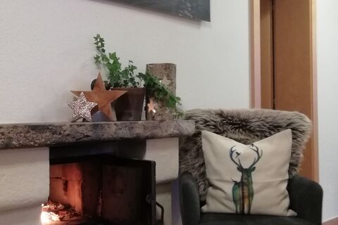 Wohnzimmer mit Kachelofen,TV, Internet, ein großes Bad mit Dusche und Badewanne, ein separates Gäste-WC, sonnige Terrasse und Garten mit Blick auf die umliegenden Berge, Hohe Munde und Gehrenspitze.