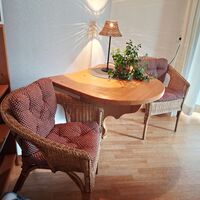 Die erste Wohnung "Schneerose", ca. 120qm groß, befindet sich im Parterre. Sie ist ausgestattet mit zwei Schlafzimmer, eines befindet sich im Erdgeschoss, das Zweite offene Schlafzimmer ist über eine Wendeltreppe vom Wohnzimmer aus zu erreichen.