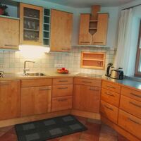 Zur weiteren Ausstattung gehört ein geräumige Wohnküche, mit einem E-Herd/Backofen, Microwelle, Kühl-und Gefrierschrank, Spülmaschine, Filter und Tapskaffeemaschine, Wasserkocher, Toaster, sowie eine elektrische Brotschneidemaschine,