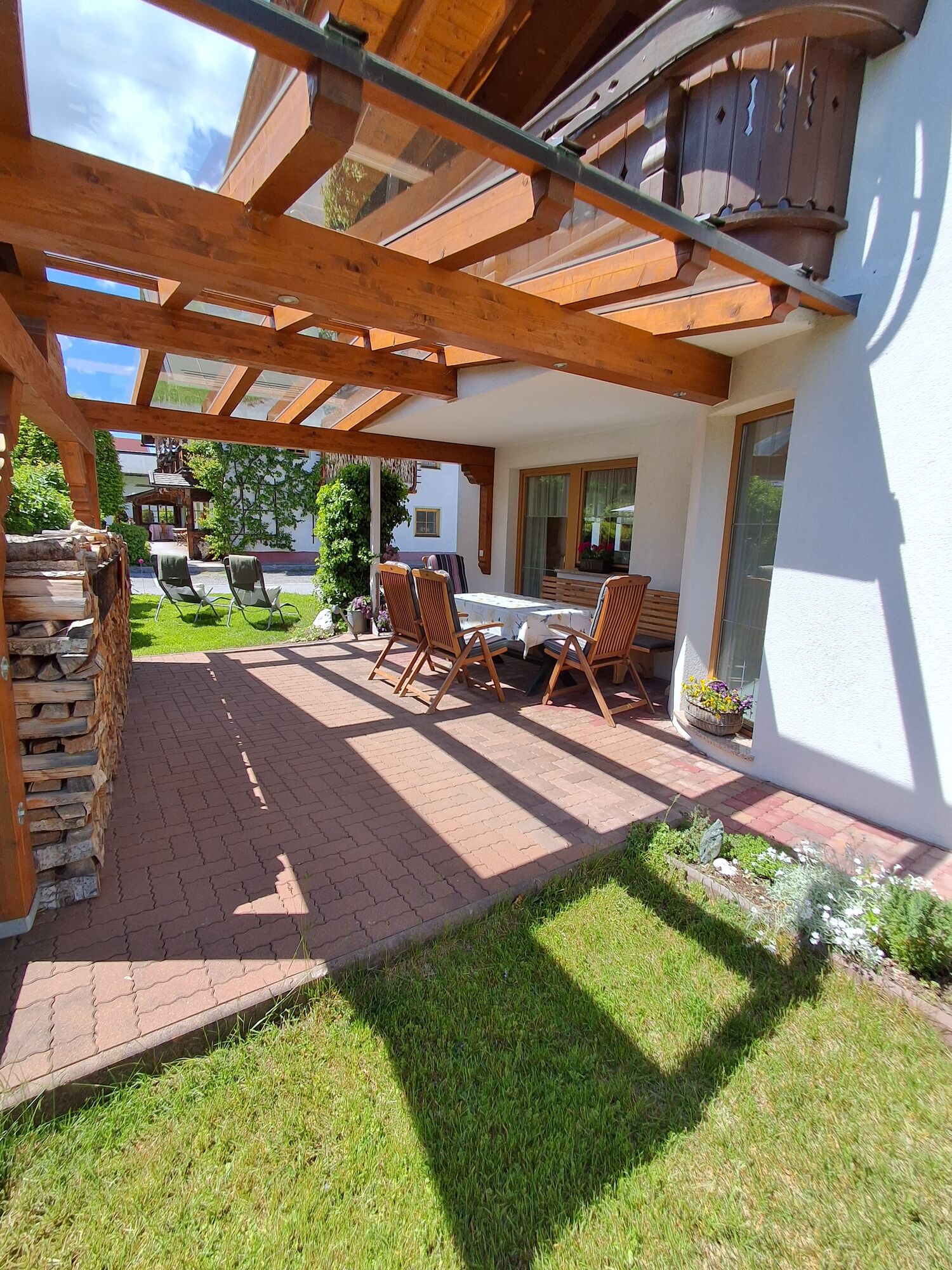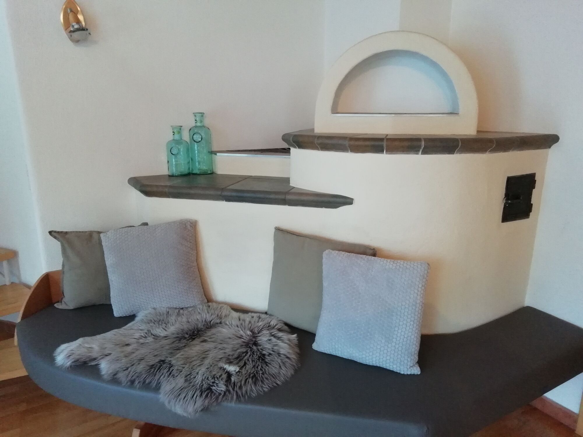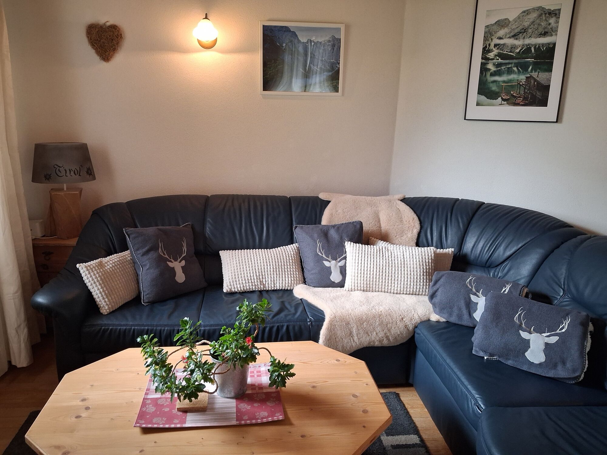 Wohnzimmer mit Kachelofen,TV, Internet, ein großes Bad mit Dusche und Badewanne, ein separates Gäste-WC, sonnige Terrasse und Garten mit Blick auf die umliegenden Berge, Hohe Munde und Gehrenspitze.