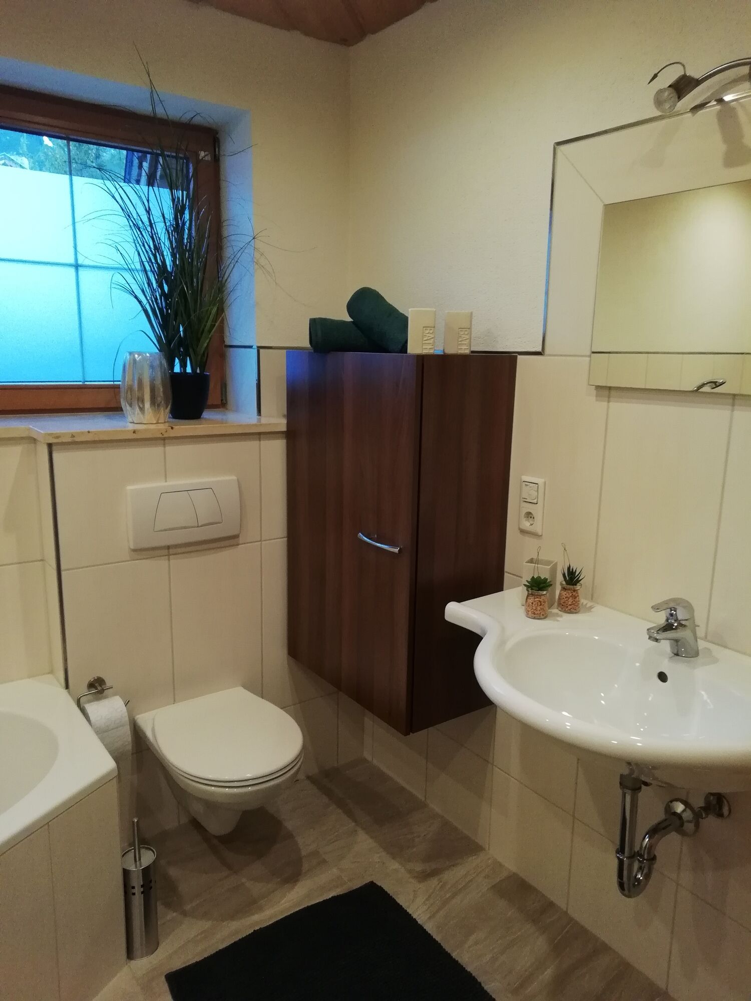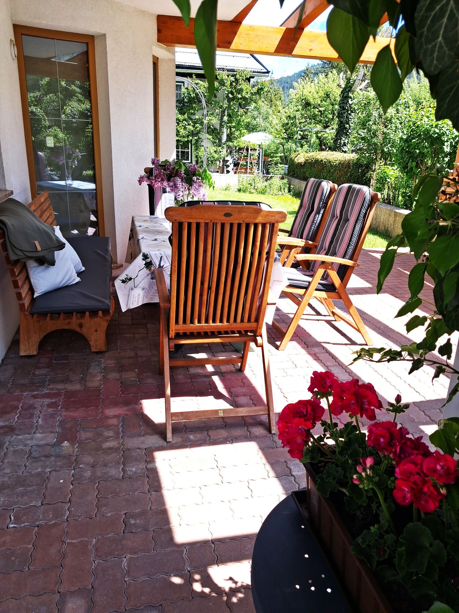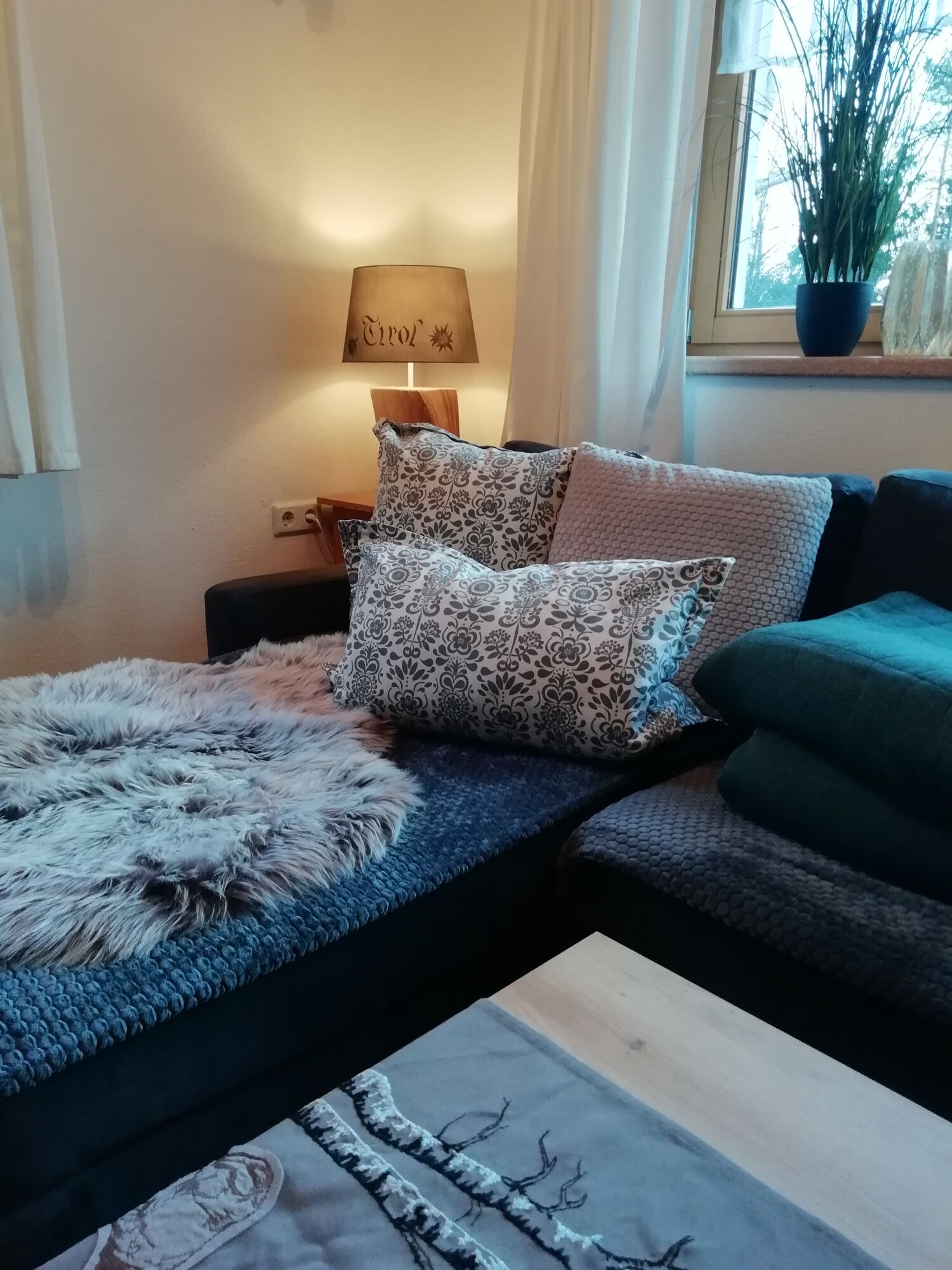 Wohnzimmer mit Kachelofen,TV, Internet, ein großes Bad mit Dusche und Badewanne, ein separates Gäste-WC, sonnige Terrasse und Garten mit Blick auf die umliegenden Berge, Hohe Munde und Gehrenspitze.