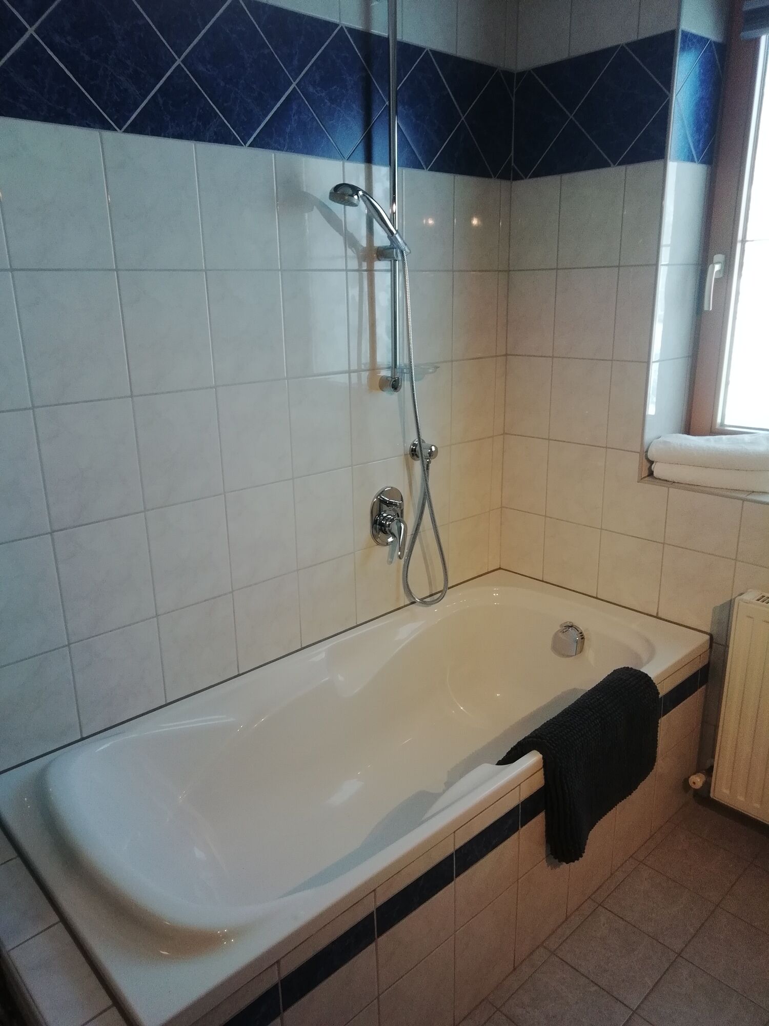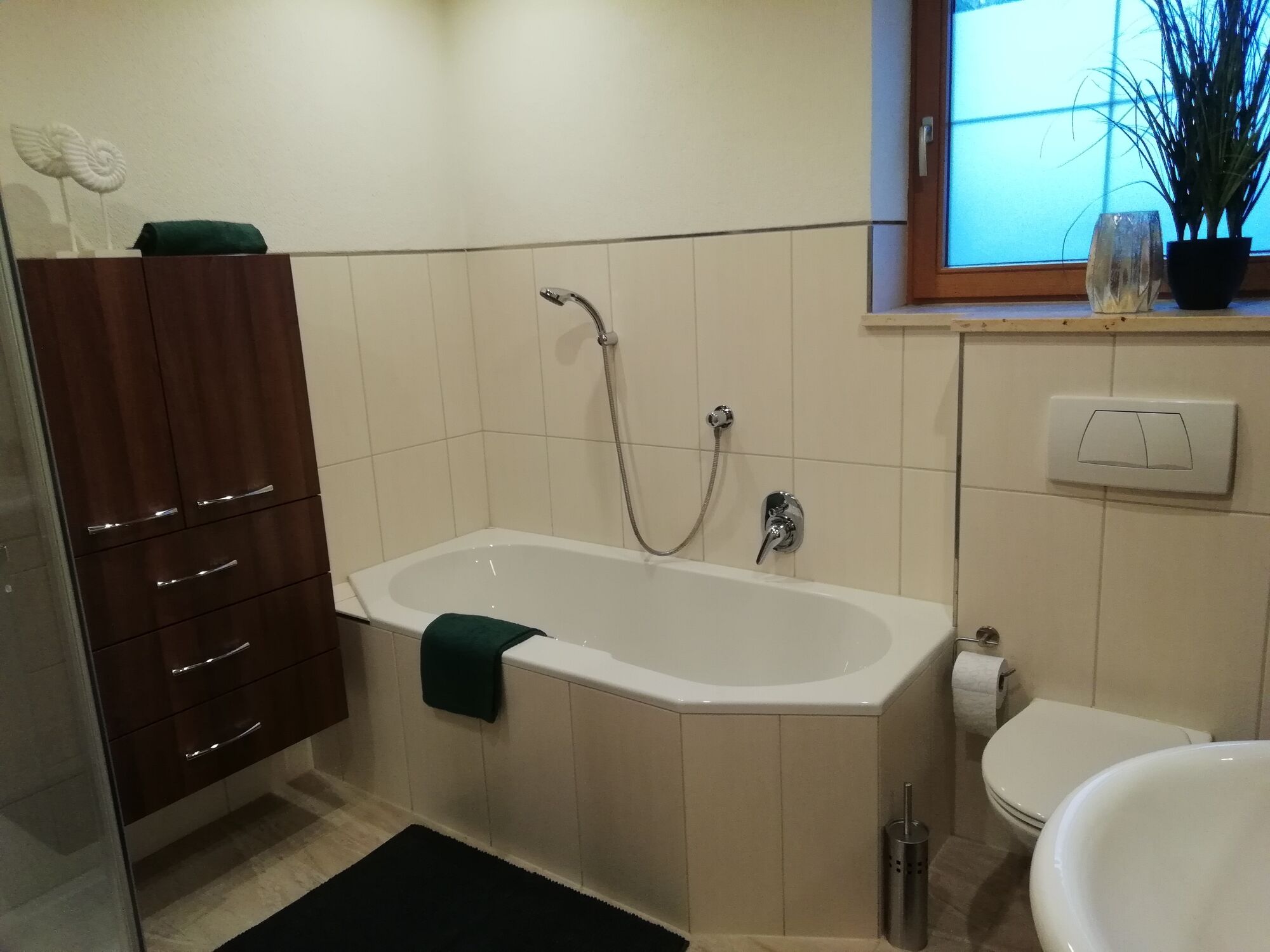 Anschließend befindet sich ein großes Wohnzimmer, Schlaf-und Badezimmer mit Badewanne.