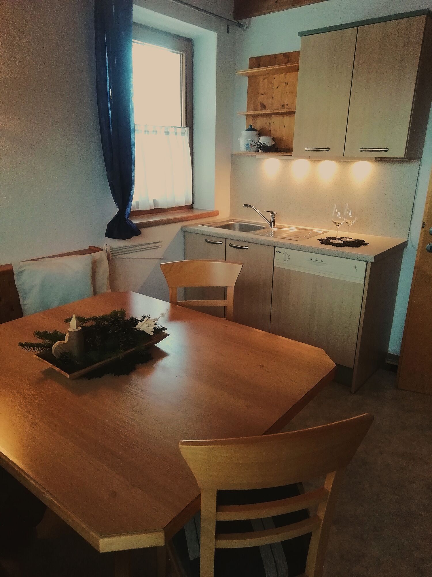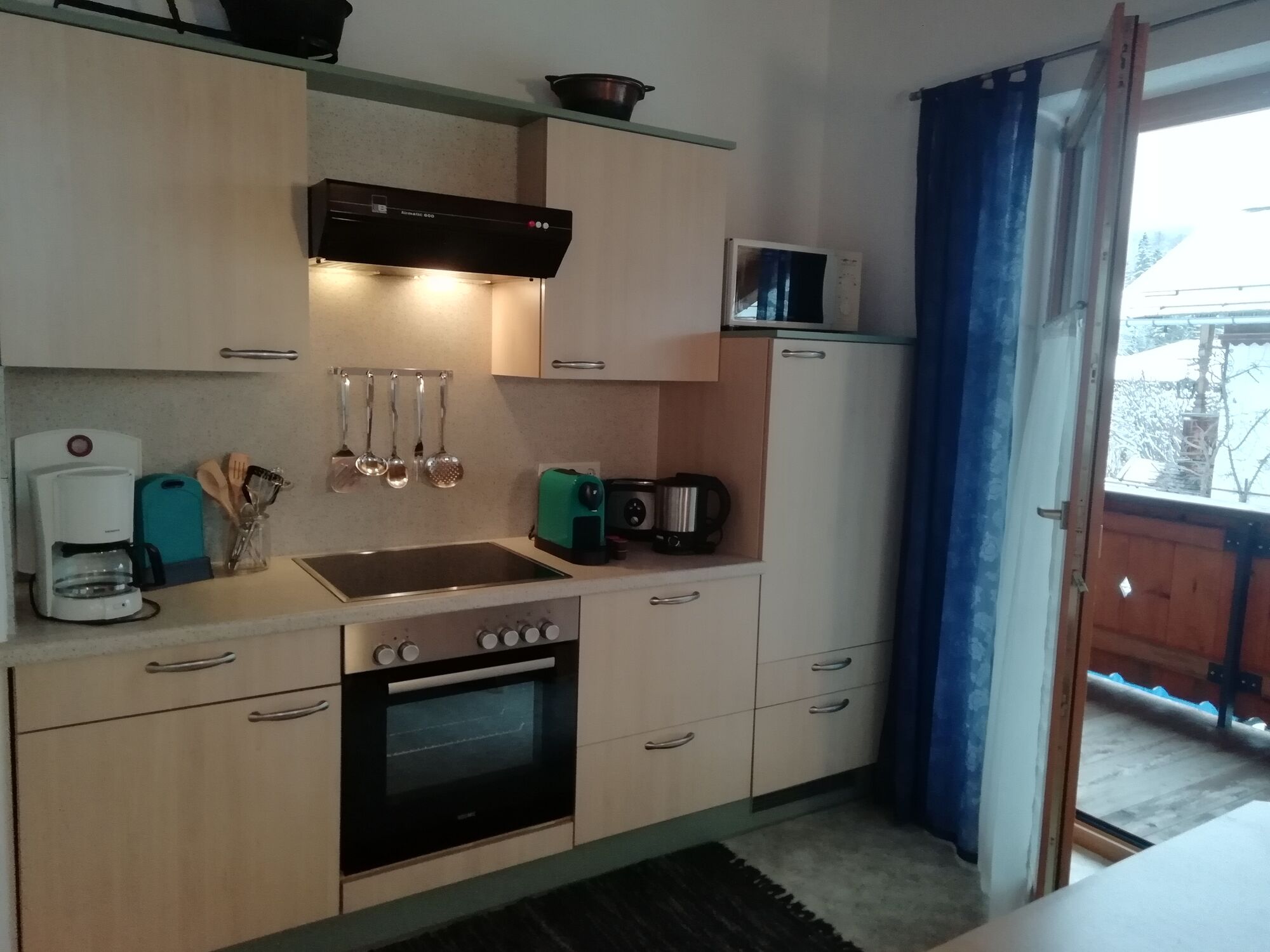 Kitchen: Tabs and filter coffee machine, kettle, toaster, dishwasher, electric stove, access to the balcony/view of Hohe Munde, Gehrenspitze