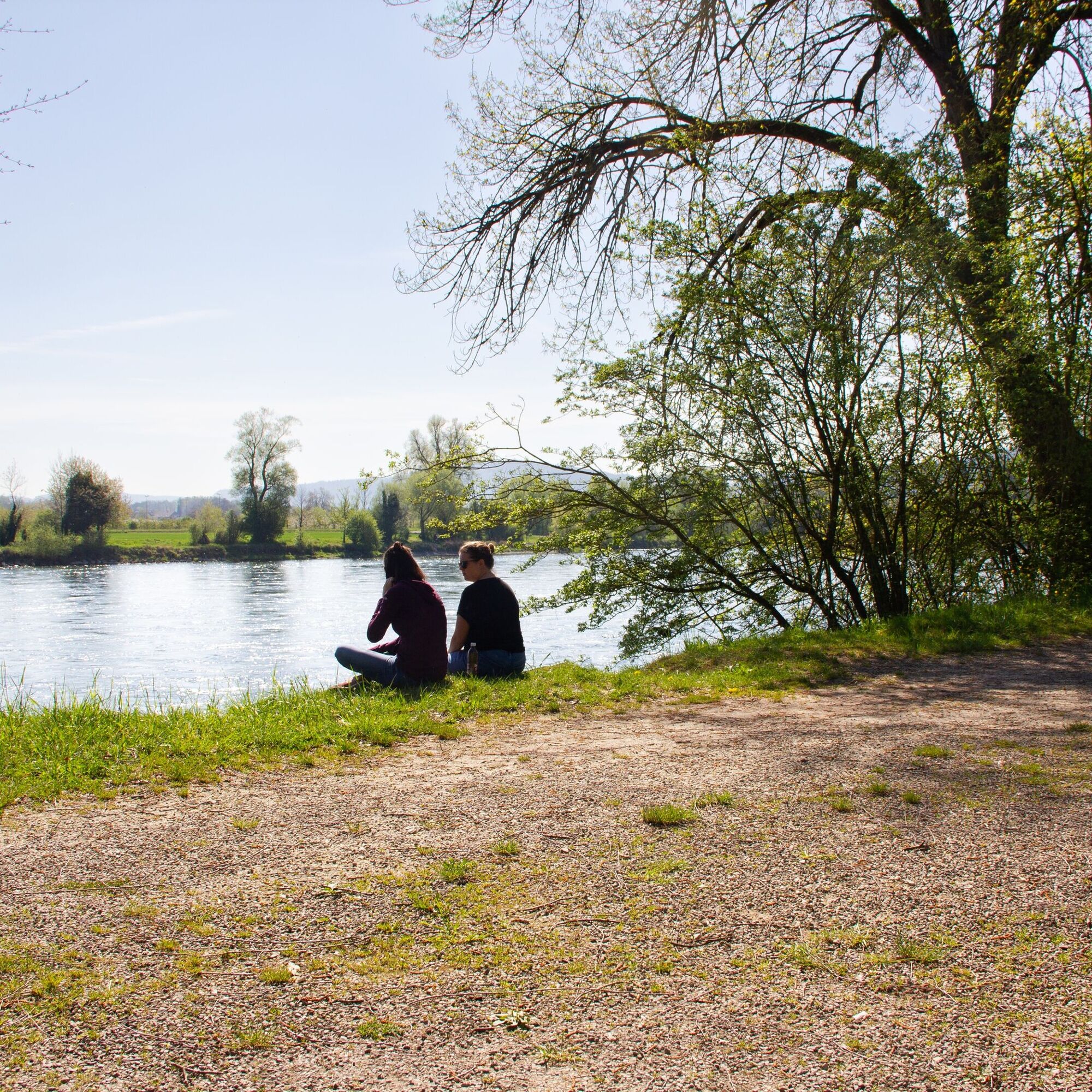 After the stop at the bakery, return to Veloroute 2 «Rhine Route» heading towards Rietheim/Laufenburg/Rheinfelden until you reach Rietheim. In Rietheim, at the end of Badstrasse, turn right following the blue arrow, go under the railway underpass, and straight across the street to reach the floodplain «Chly Rhy». Now follow the stream to the Aue Chly Rhy parking lot. Here turn right and then continue along the Rhine shore path / Helsana Trail about 7.4 km towards Rümikon to Rekingen. Cyclists are allowed on this path; if riding is prohibited, use the parallel paved road.