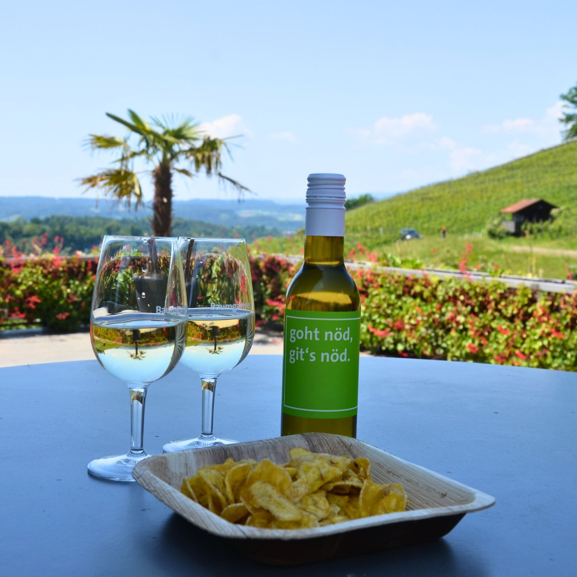 3rd Stop Remise Baumgartner Weinbau, Tegerfelden: In the midst of the vineyard landscape, alongside a fantastic view, enjoy a 2.5 dl bottle of wine from Baumgartner Weinbau and a pack of Aargau tortilla chips from Dorfgeist in Tegerfelden. Open the fridge with the code and take one bottle and one pack per person. Please close everything again and put the glasses back in the designated place after use.