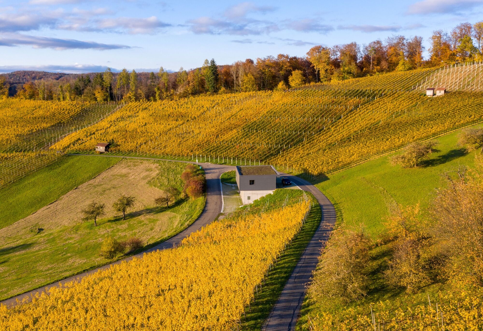 Here, go right under the underpass and follow the path to the signs «Wine hiking trail». Follow the arrow left to reach the next destination, the Baumgartner family’s barn. In the middle of the vineyards is the grey building with a fantastic view. Stop No. 3.