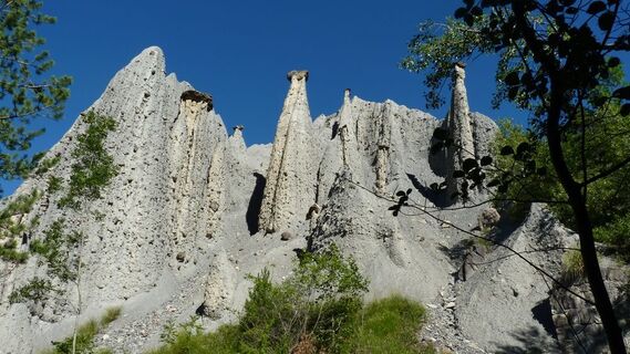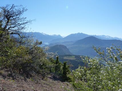 Prendre le chemin forestier qui traverse le torrent du Vallauria. Rapidement après, se présente une patte d'oie. Emprunter la piste de droite, à plat, direction Mont Colombis. Poursuivre sur 900 m sur cette jolie piste forestière. Prendre le temps de se retourner pour admirer le village perché de Théus. Bifurquer sur la gauche sur un sentier ascendant en sous bois. Ce dernier mène progressivement aux alpages de Serre Giraud. De là, les vues se dégagent sur la vallée de la Durance et la chaine de la Blanche. Croiser une bâtisse en pierre et continuer l'ascension par la piste en direction du sommet, pour rejoindre l'Échine de l'âne. Quitter la piste au profit d'un sentier caillouteux cheminant sur la crête. En arrière-plan se dessine la vaste plaine fruitière de la Durance. Au fur et a mesure de l'ascension, les vues sur l'est et l'ouest s'ouvrent, offrant le Dévoluy, les Monges, la Blanche et l'Ubaye au plaisir des yeux. Poursuivre sur ce sentier jusqu’au sommet du Mont Colombis. L'aire de décollage de vol libre indique la fin de l'ascension. Continuer néanmoins jusqu'aux antennes. Prendre la route par la droite, pour aller découvrir le fabuleux point de vue du sommet. Après une pause bien méritée, rebrousser chemin par la route. Prendre a droite aux antennes, toujours sur la route et amorcer ainsi la descente. Quitter la route pour plonger dans le ravin du Vallauria et découvrir la salle de bal des Demoiselles coiffées de l'intérieur . De nombreux ouvrages ont été créés par l'homme pour tenter de dompter le torrent. Entre les pins, les grandes dames de terre et de pierre s'élancent. Le sentier chemine entre rive droite et rive gauche du torrent, le traversant plusieures fois. Il fini par déboucher sur une piste, qui ramène à la toute première croisée des chemins. De la, prendre à droite pour retrouver le parking de départ.