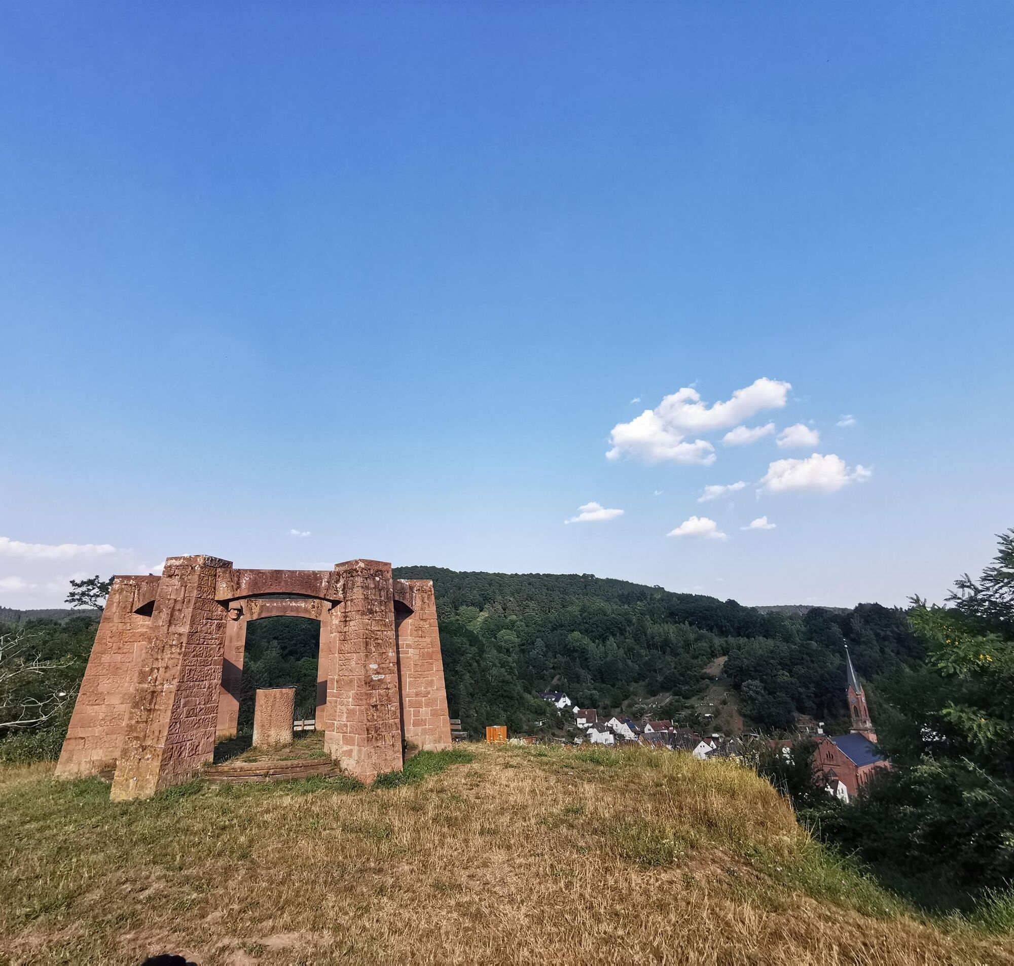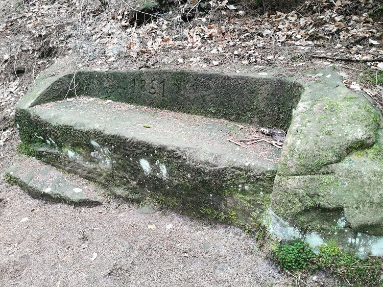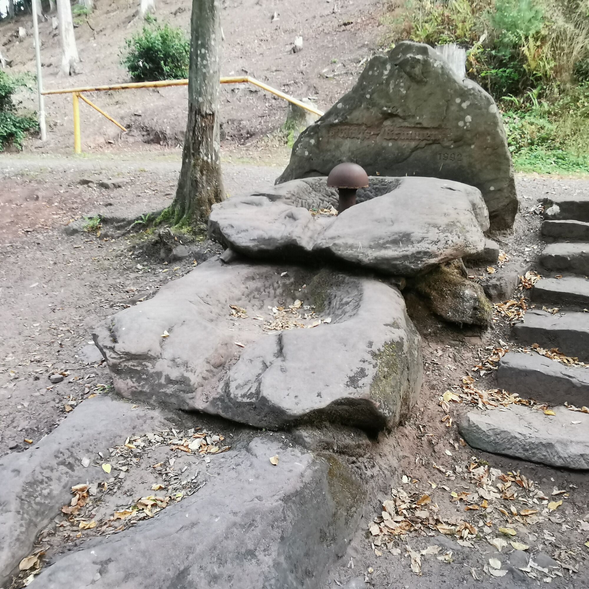 Shortly before reaching District Road 23, you can take a small detour to the viewpoint "Esthaler Vorstadt". It is 300m off our path. Opposite the sports hall is the beautifully designed "Wögelbrunnen". A short detour worth taking. The Wögelbrunnen is part of the Fountain Trail, which leads around Esthal. We continue to follow the marking of the Palatinate Hut Trail to reach Esthal. At the entrance to the village is the "Tränkenbrunnen" - an old wash fountain that was formerly used for washing laundry. In Esthal, there is also the opportunity to stop by the "Esthaler Bürgerstübl". Along the street through Esthal there is much to discover. At the height of the school / community center, we can take a small detour of 100m to another stone from the school project. After passing the street along Esthal, we come to another very nicely designed fountain, the "Schelmenteich Fountain". Then we go down a path towards the Wolfsschluchthütte (serving food). After our stop at the Wolfsschluchthütte, we go back a short distance (about 300m) on our "old path". Then we continue straight ahead and follow the marking of the Palatinate Hut Trail. At Nauwiese, we enter the "Dreibrunnental", along the Breitenbach over the Goldbrunnen and the following Dreibrunnenbach, we pass a shelter with a rest area. At the Esthaler Bänke there is a triangular boundary stone that marks the boundary of the three municipalities Esthal - Elmstein - Weidenthal. From the Esthaler Bänke, the route goes down to the Weißenbach and over the Stempelweg to the train stop in Weidenthal.