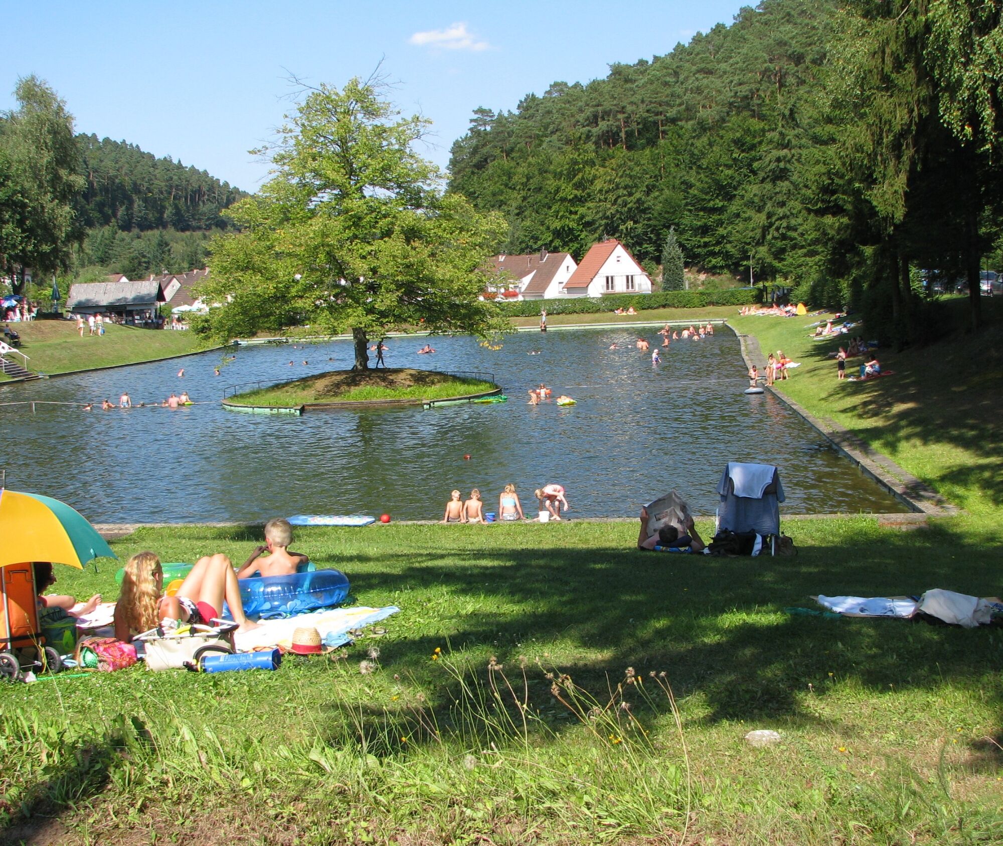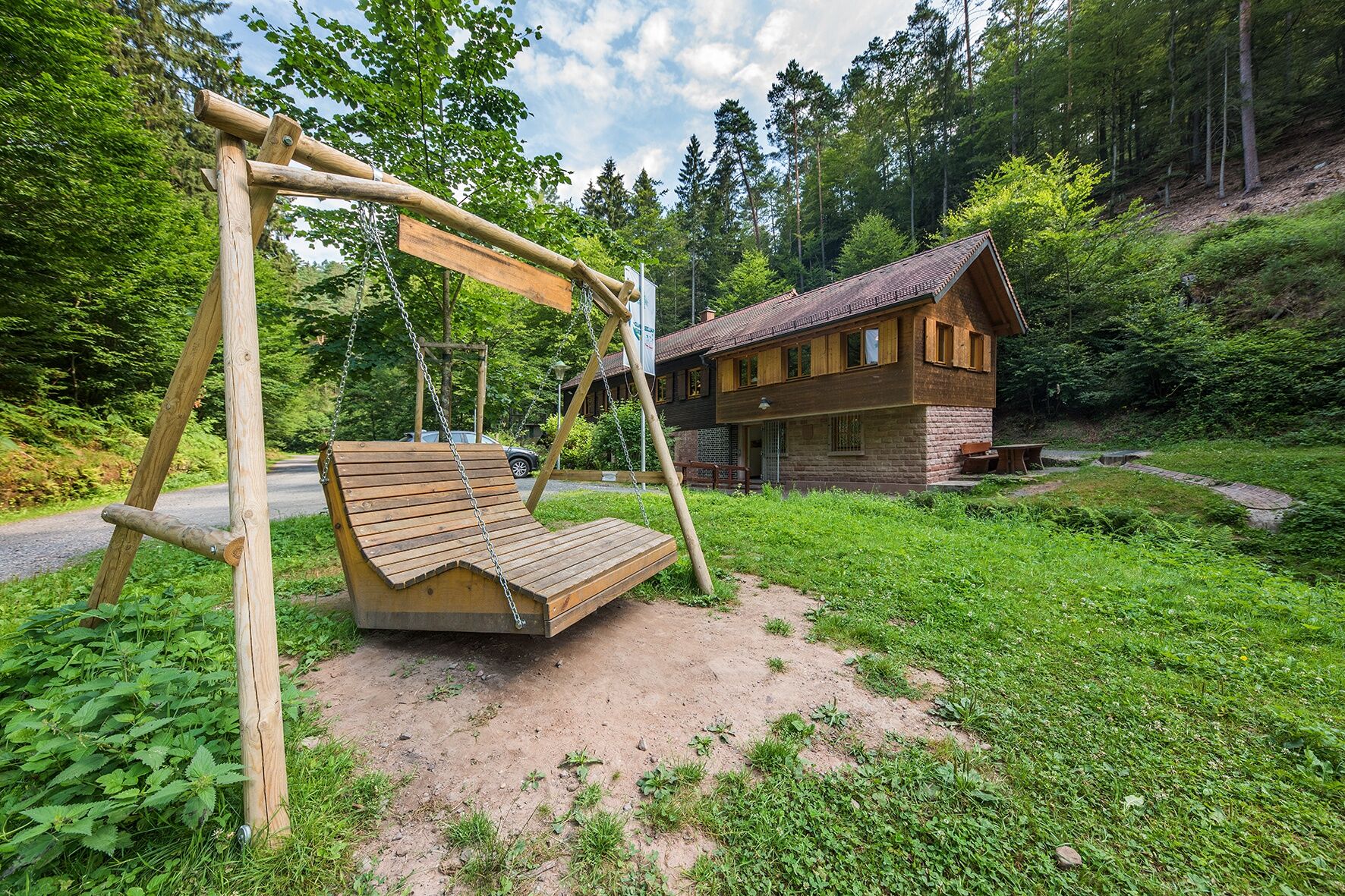 From Neidenfels we continue to follow the Palatinate Hut Trail marking, which takes us through the village of Esthal. Passing historic fountains and the Wolfsschluchthütte, we leave the village and follow the marking to the junction "Eschdler Bänke" on the Heidenkopf, passing a shelter to Weidenthal. There is accommodation available at the Bärbel holiday apartment in Weidenthal (06329-1209, mobile: 0151-57787575).