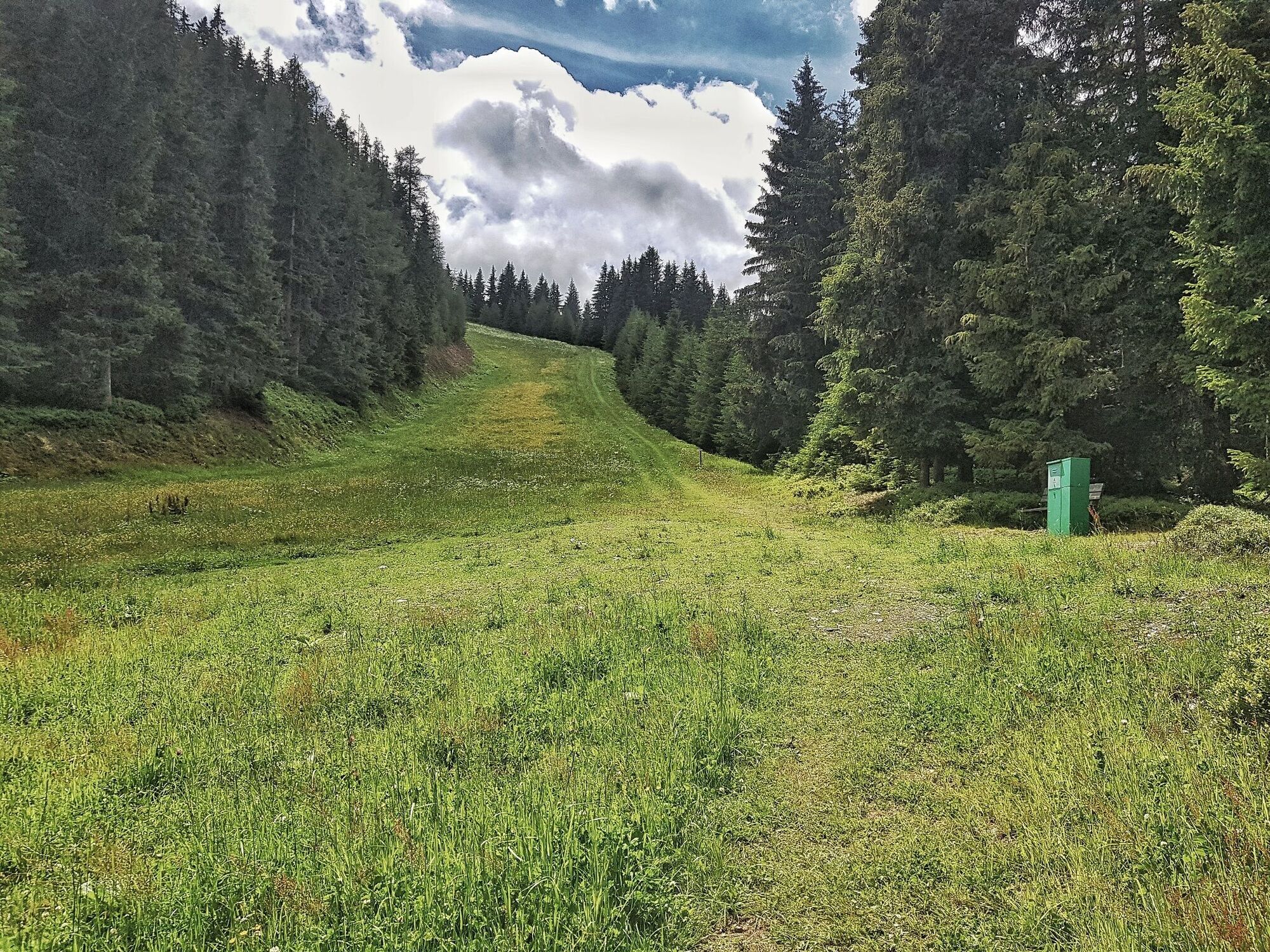 Durch den Wald bergauf querst Du 2 Forstwege und die Hochwurzenstraße (ACHTUNG: hier fahren die Mountain Gokarts!). Erneut geht es über eine Wiese (Skipiste) und durch den Wald bis Du wieder auf eine Wiese (die winterliche "FIS-Abfahrt") gelangst, die Du nun einige hundert Meter bergauf läufst. Dann zweigst Du rechts auf den Trail im Wald ab und dieser schöne Wurzelsteig führt Dich - am Schluss in einigen kleinen Serpentinen - auf den Gipfel der Hochwurzen mit der Hochwurzenhütte.