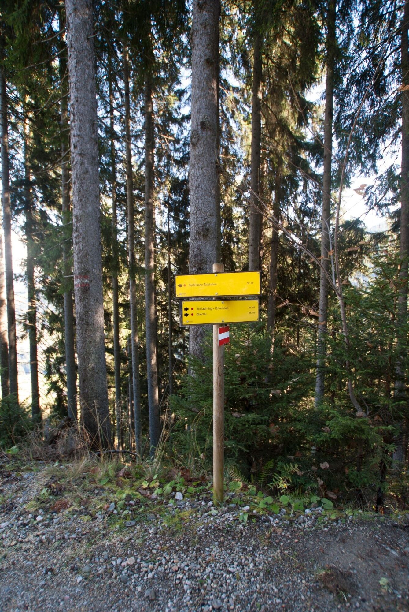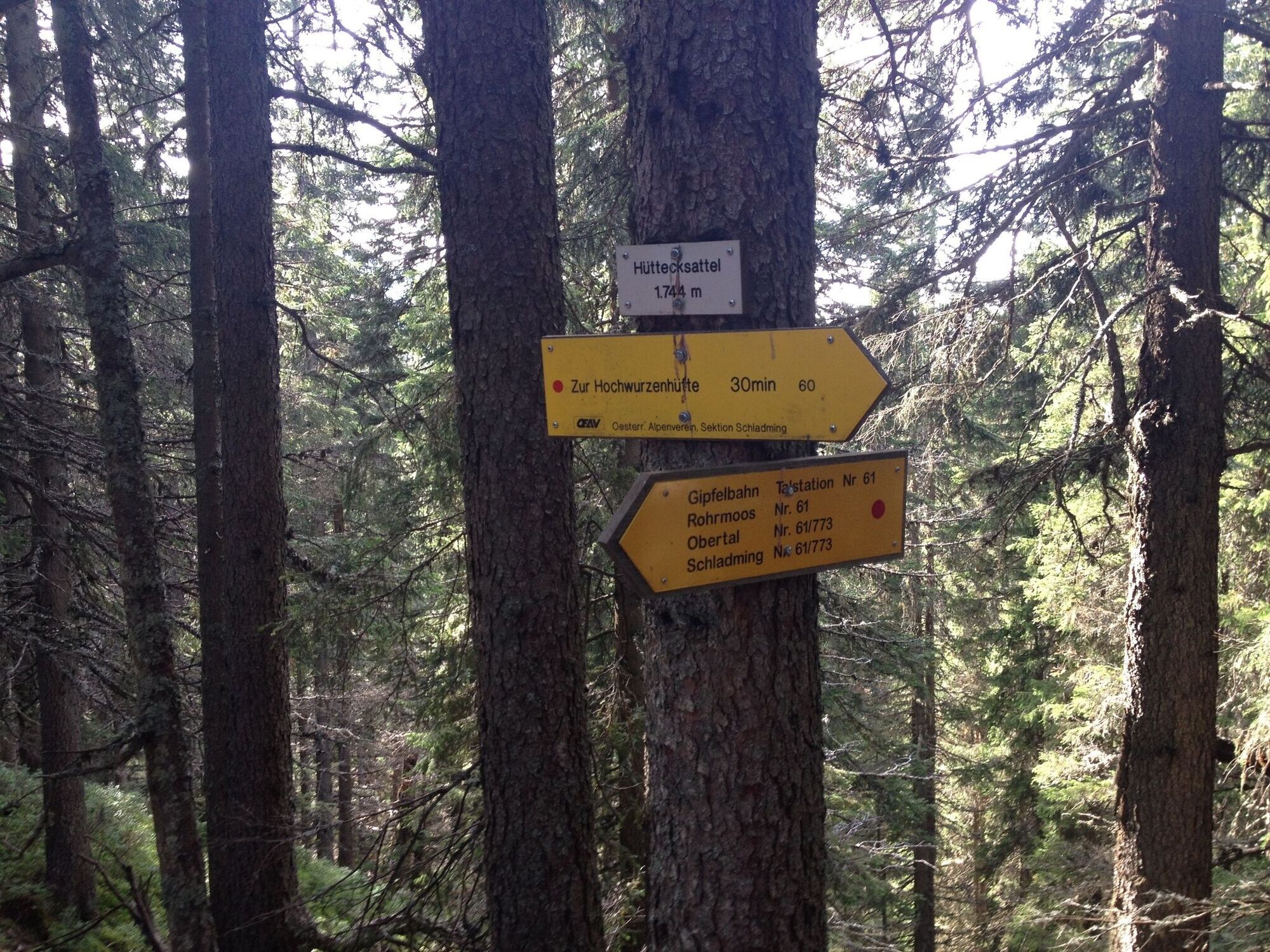 Vom Startpunkt am Wanderportal Hochwurzen-Tal läufst Du - vorbei an der Talstation - auf dem Wanderweg #60 los. Dieser zweigt etwa 250 m weiter, bei der Bergstation der Sesselbahn Rohrmoos II, nach links in den Wald ab. Bergauf durch den Wald und über eine Wiesenquerung (Skipiste) gelangst Du zum Wegkreuz #60 wo du nach links bergauf weiterläufst (nach rechts führt hier der Bernhard Knauß Trail).