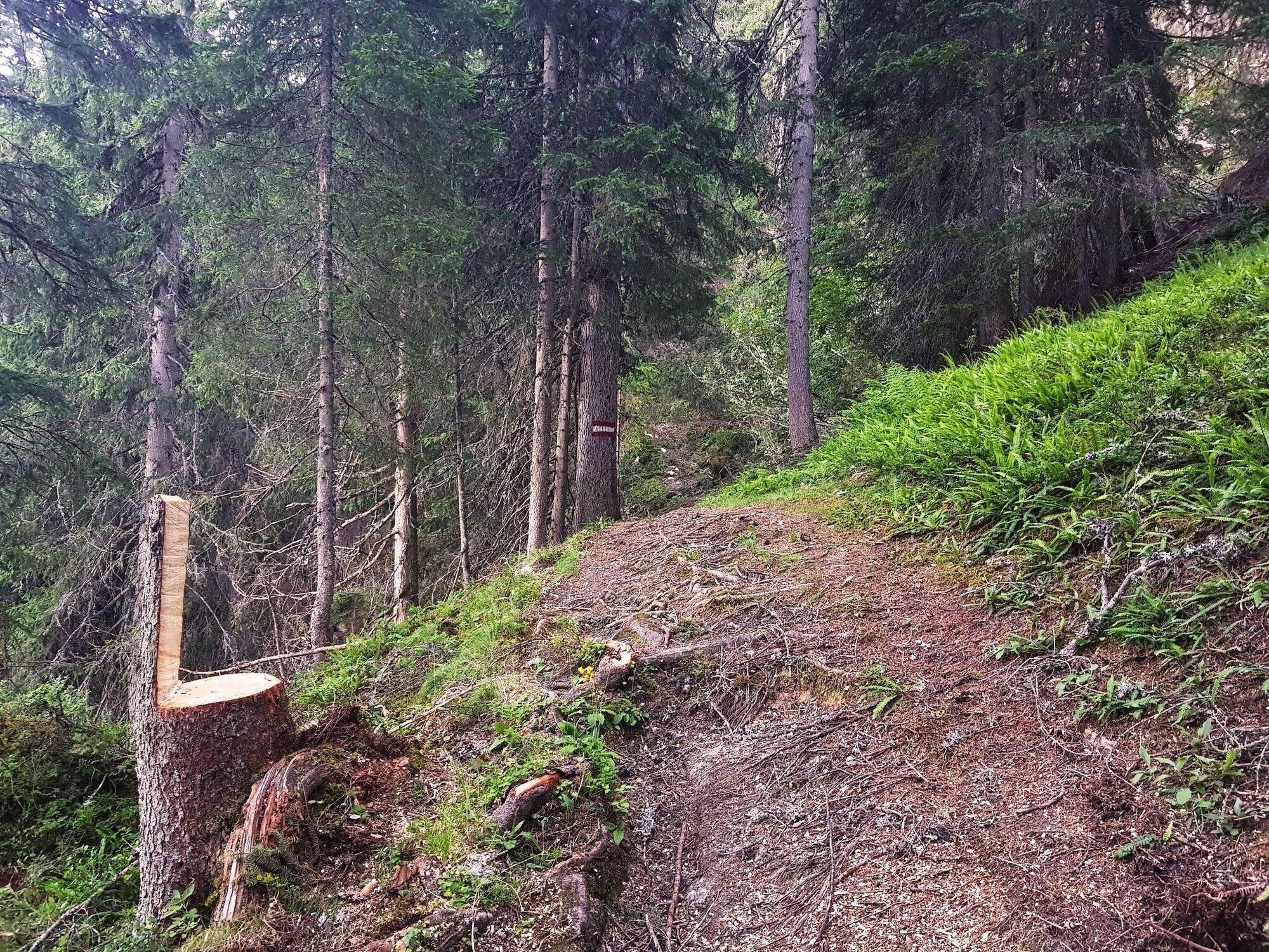 Der Hochwurzen Trail zweigt allerdings gleich wieder rechts vom Forstweg ab (Weg #773) und führt Dich über einen schönen Waldpfad weiter bergab bis Du wiederum einen Forstweg und die "Schwammerlstadt" des Schwammerlweges erreichst, welchem Du nun zurück zur Talstation der Gipfelbahn Hochwurzen und Deinem Ausgangspunkt folgst.