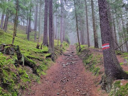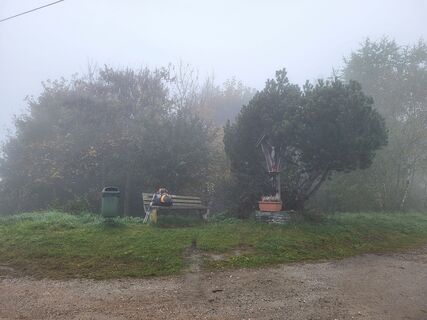 Bei Nebel ging es östlich vom Trabochersee steil durch den Wald aufwärts auf den sogenannten Schafberg. Weiter ging es ganz moderat, auf Güter-, Feld und Wiesenwegen. Beim Bauer in der Höh führt der Weg weiter oben am Waldrand entlang, bevor es wieder durch den Wald hinunter nach Leoben geht. Am Ende des Weges findet sich eine Tafel, welche auf eine NSWW 05 Kontrollstelle hinweist. 150m links, Gasthaus Sebinger steht darauf zu lesen. Dieses Gasthaus gibt es schon lange nicht mehr. Anzumerken wäre auch noch, dass am Sonntag nur 2 Caféhäuser und kein Gasthaus oder Restaurant am Hauptplatz offen haben.