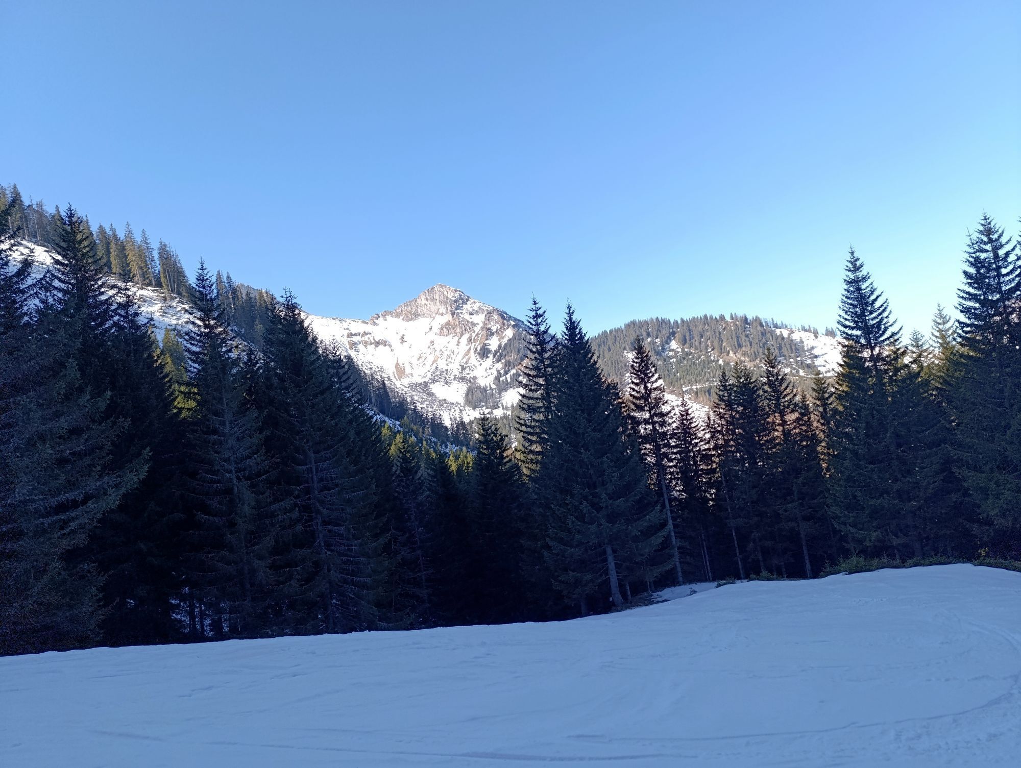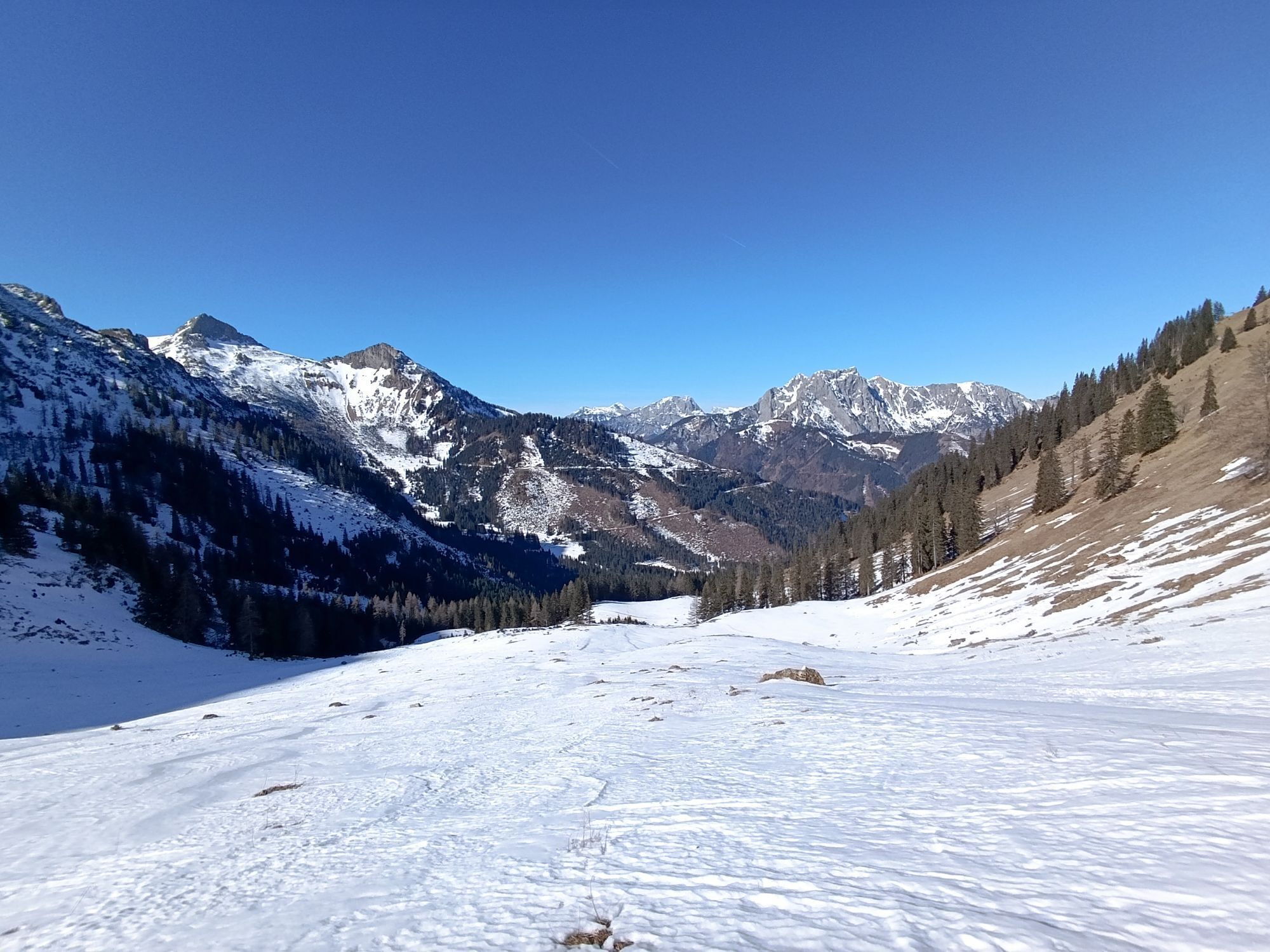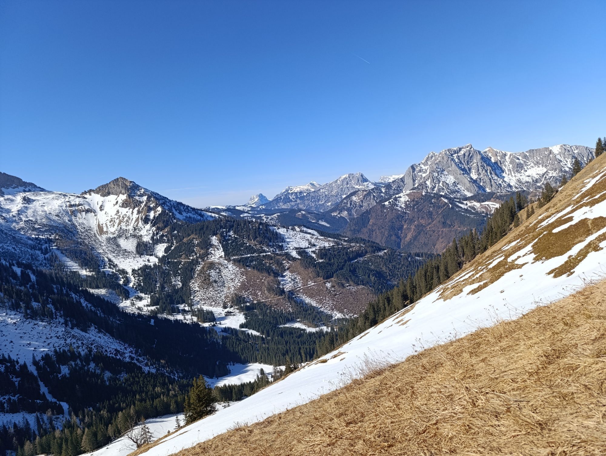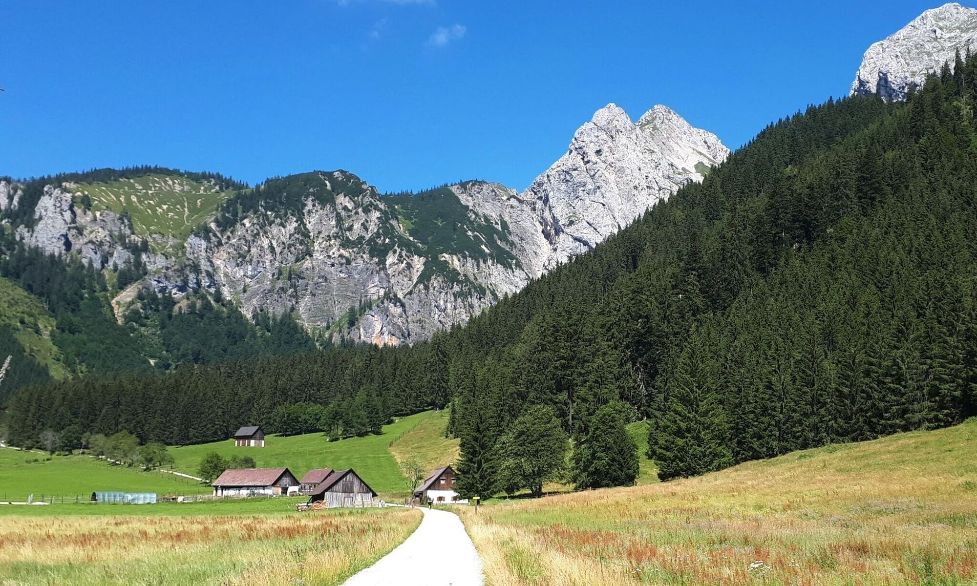 Abstieg vom Gipfel der Donnersalpe (1539m) auf dem markierten Steig (Almbodenm unangenehme "Kuhtritte") zu einer Forststraße. Diese wird gequert und durch Wald zu den Wiesen und Gehöften am Hohenegg (ca. 970m) abgestiegen. Stellenweise schlecht markiert, auf Wegweiser und Markierungen achten. Vom Hohenegg auf einem schattigen Waldweg in die Ramsau (865m), Rückweg zum Ausgangspunkt zusätzlich 2,8km Fahrstraße (45Min.).