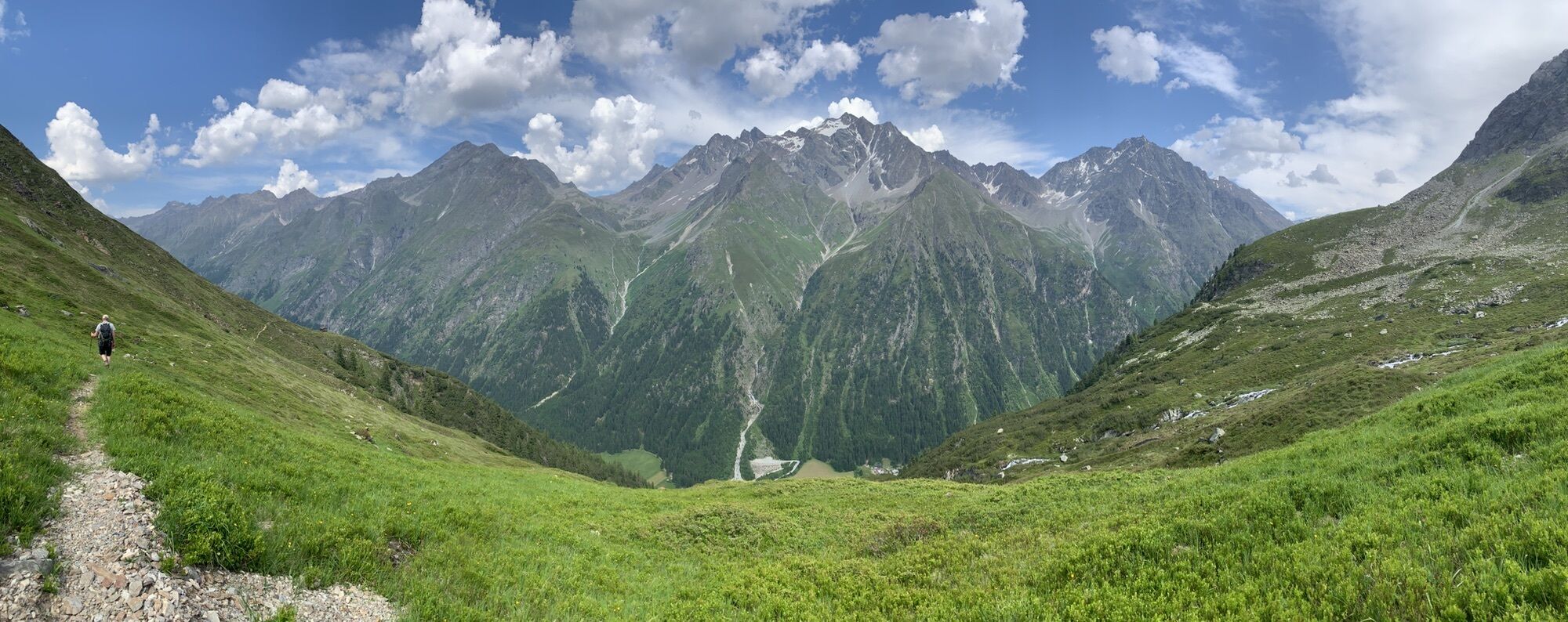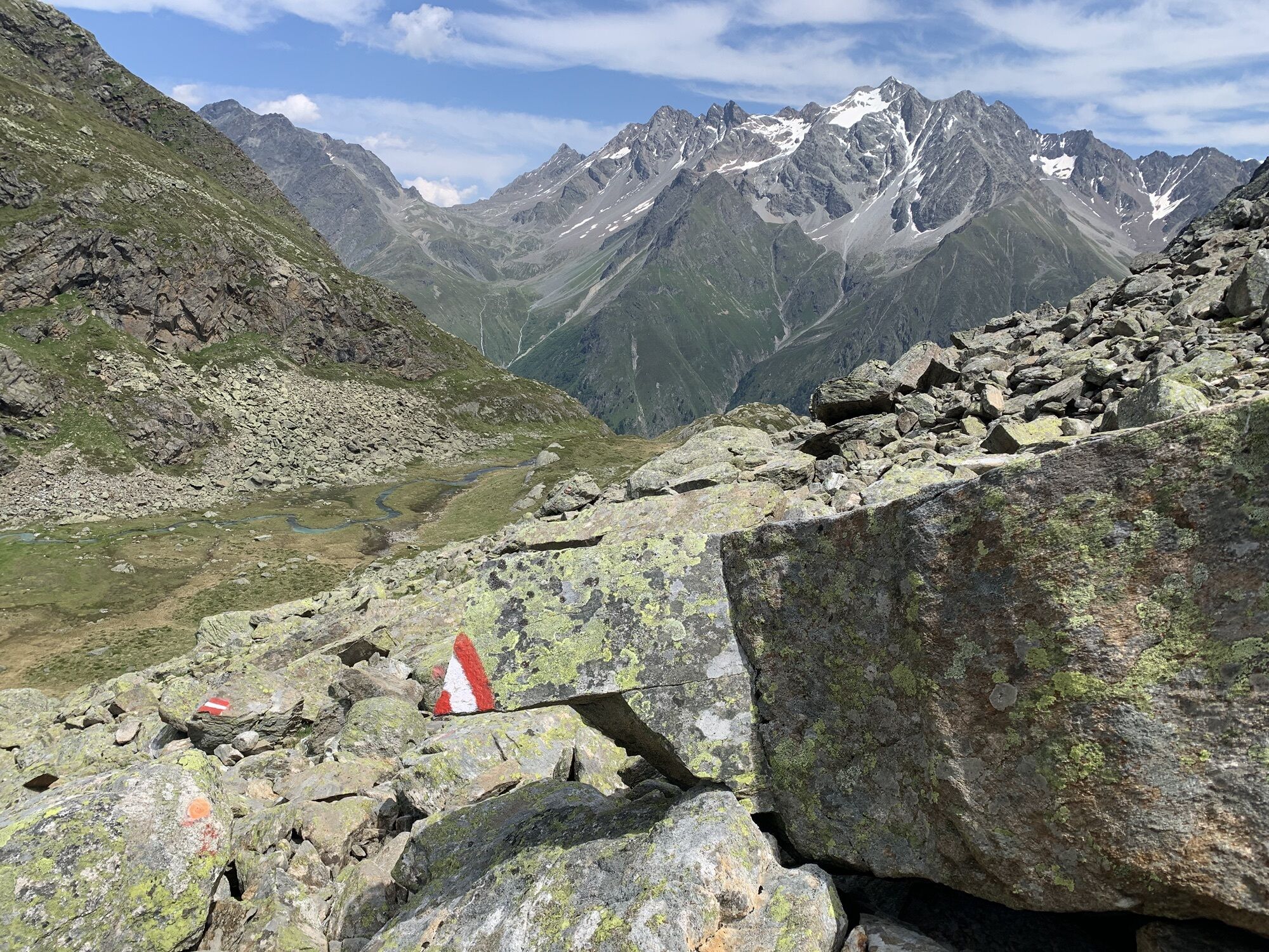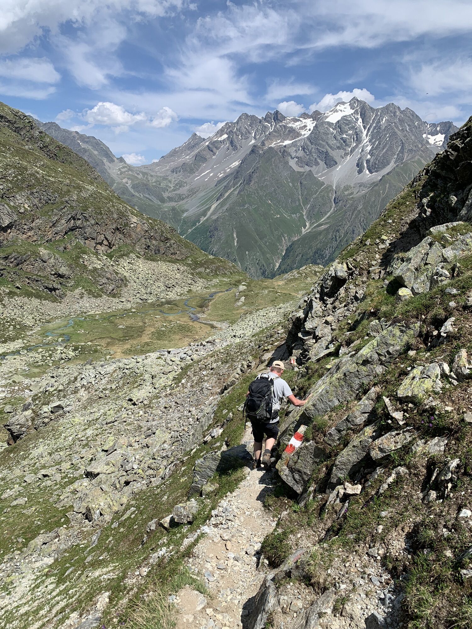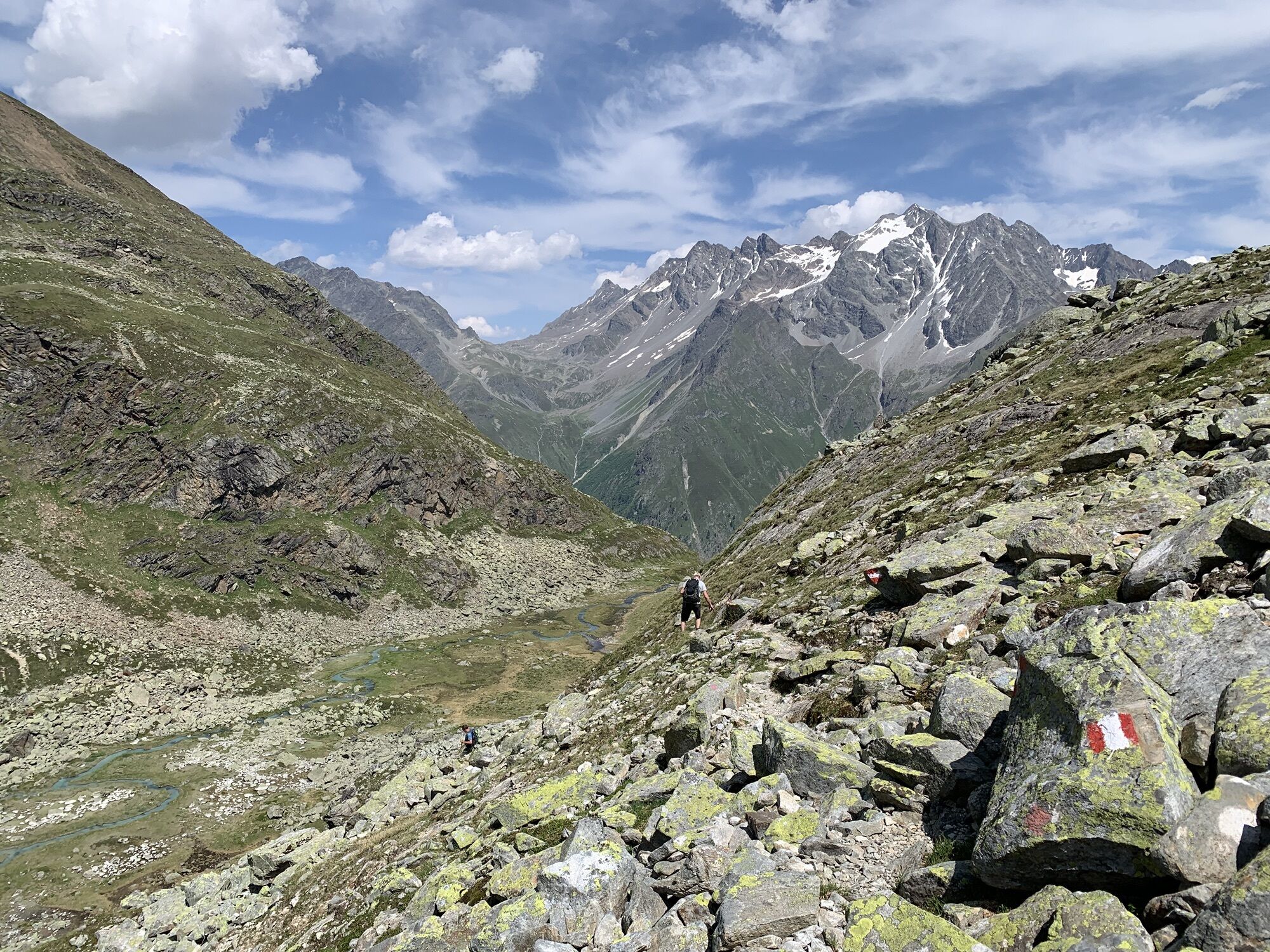 Von Mandarfen auf dem Wirtschaftsweg am Fluss entlang nach Plangeross. Dort steil hinauf, an der nicht bewirtschafteten Plangeroß Alm vorbei, zur Kaunergrathütte (2.817 m). Von der Kaunergrathütte nach Nordosten zum Steinbockjoch, dem höchsten Punkt der Tour (2.950 m). Weiter an einem kleinen Bergsee vorbei zu auf dem Sassen. Dann links abbiegen zum smaragdgrünen Mittelberglesee. Am See vorbei, dann rechts hinab Richtung Neururer Alpe/Trenkwald (NICHT geradeaus hinauf zum Verpeiljoch!).