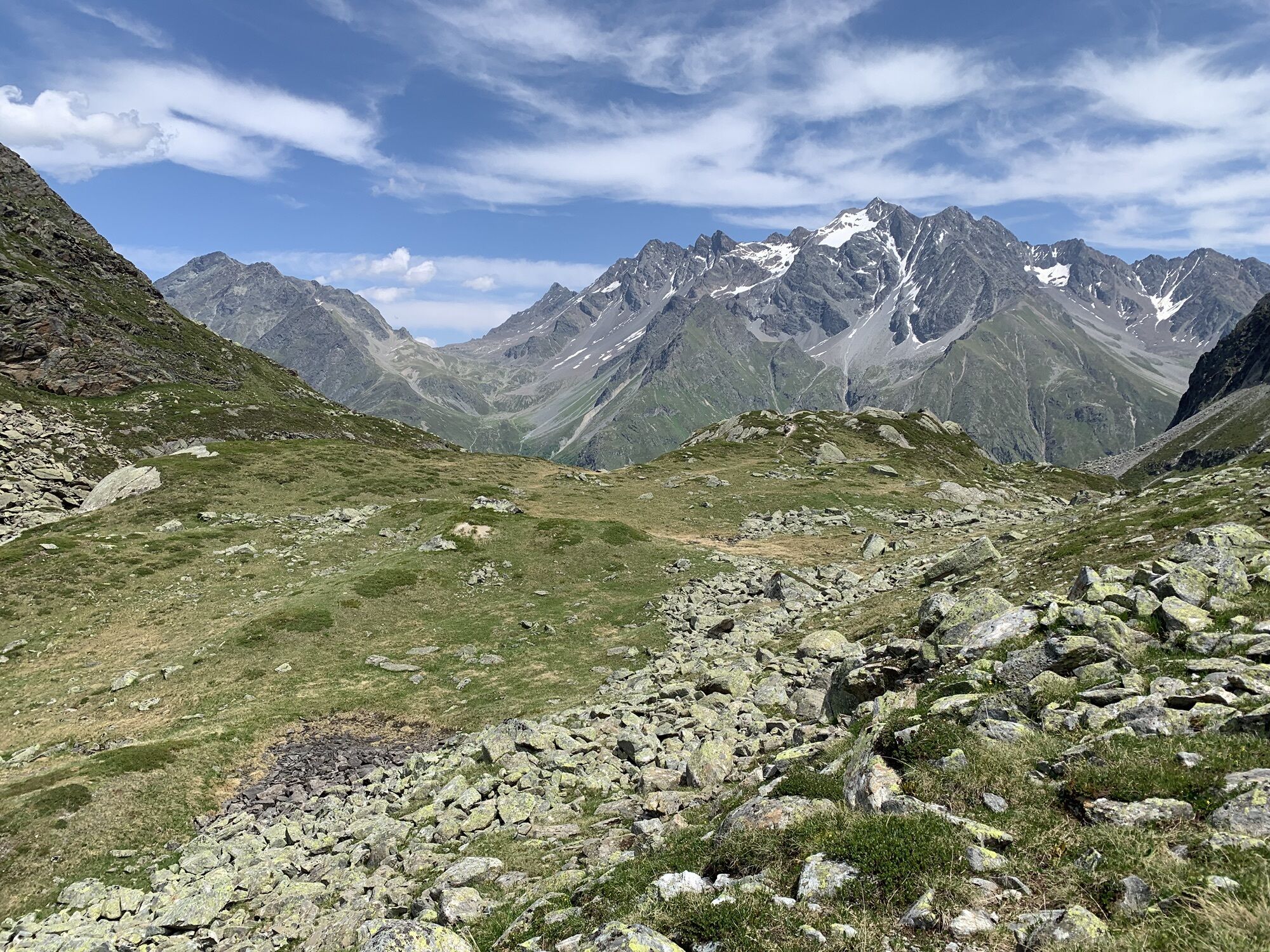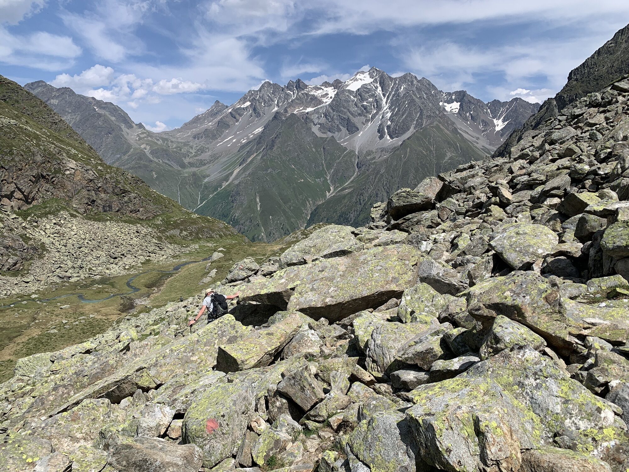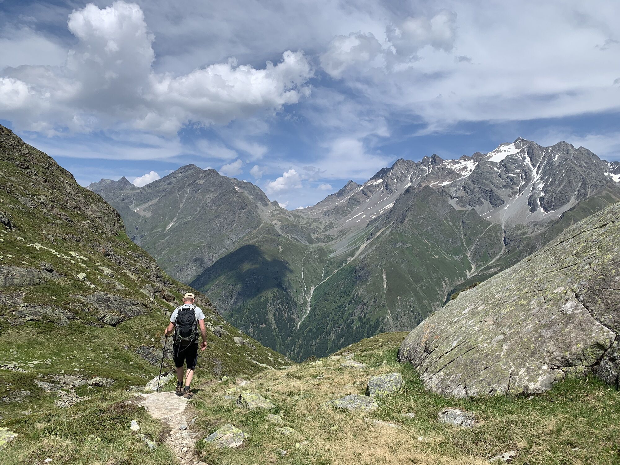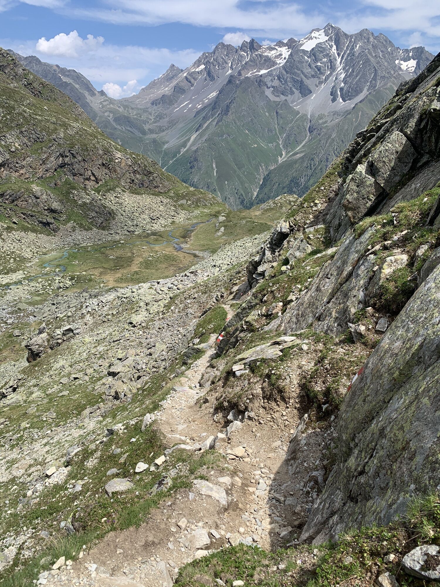 Von Mandarfen auf dem Wirtschaftsweg am Fluss entlang nach Plangeross. Dort steil hinauf, an der nicht bewirtschafteten Plangeroß Alm vorbei, zur Kaunergrathütte (2.817 m). Von der Kaunergrathütte nach Nordosten zum Steinbockjoch, dem höchsten Punkt der Tour (2.950 m). Weiter an einem kleinen Bergsee vorbei zu auf dem Sassen. Dann links abbiegen zum smaragdgrünen Mittelberglesee. Am See vorbei, dann rechts hinab Richtung Neururer Alpe/Trenkwald (NICHT geradeaus hinauf zum Verpeiljoch!).
