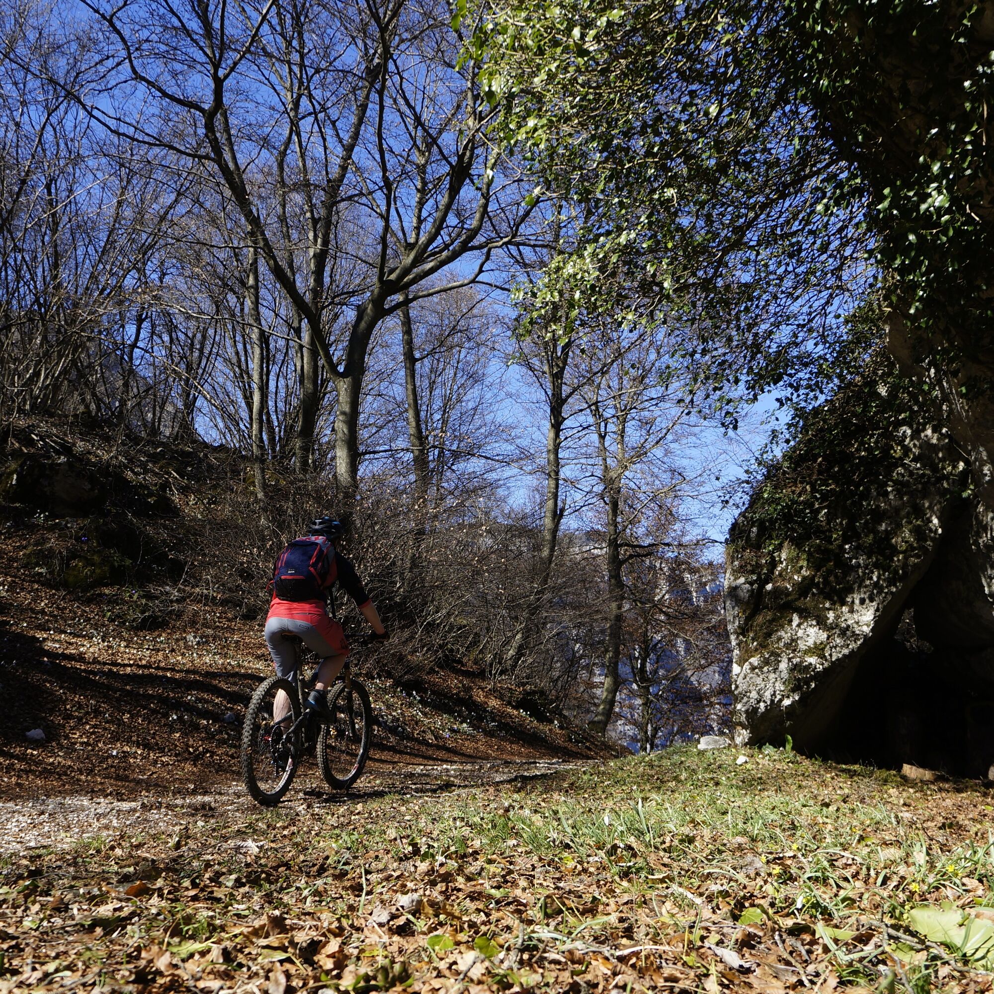 There’s never a dull moment on this tour. Varied climbs, descents and flat sections, changing terrain and a series of sights make for an unforgettable MTB experience. But let’s not get ahead of ourselves. Start by ascending to the picturesque medieval village of Canale di Tenno. From there things get flatter until you reach the shimmering, turquoise Lago di Tenno. After a long climb along the wooded slopes at the foot of Monte Misone, you have the option of branching off to Rifugio San Pietro, which is a lovely spot for a break, with its unique setting and beautiful views over Lake Garda. Shortly after that you arrive at the highest point of the tour at Sella di Calino. After reaching the hamlet of Vespana you have to climb again, then you coast along through woods and meadows, initially on gravel, later on tarmac, back to your starting point in Tenno.
