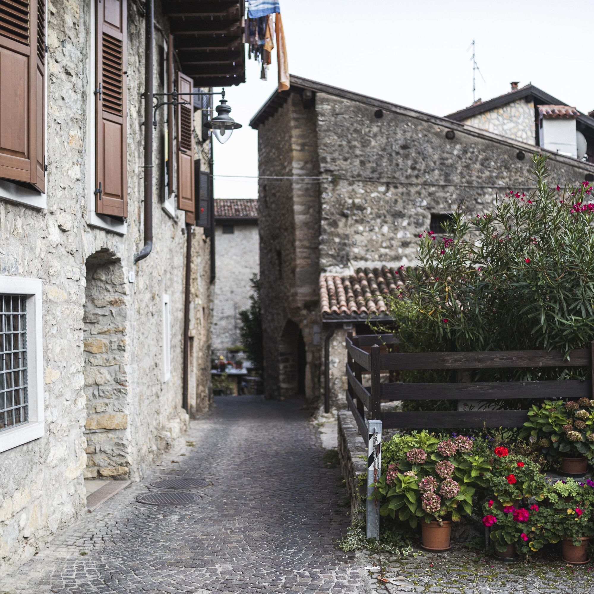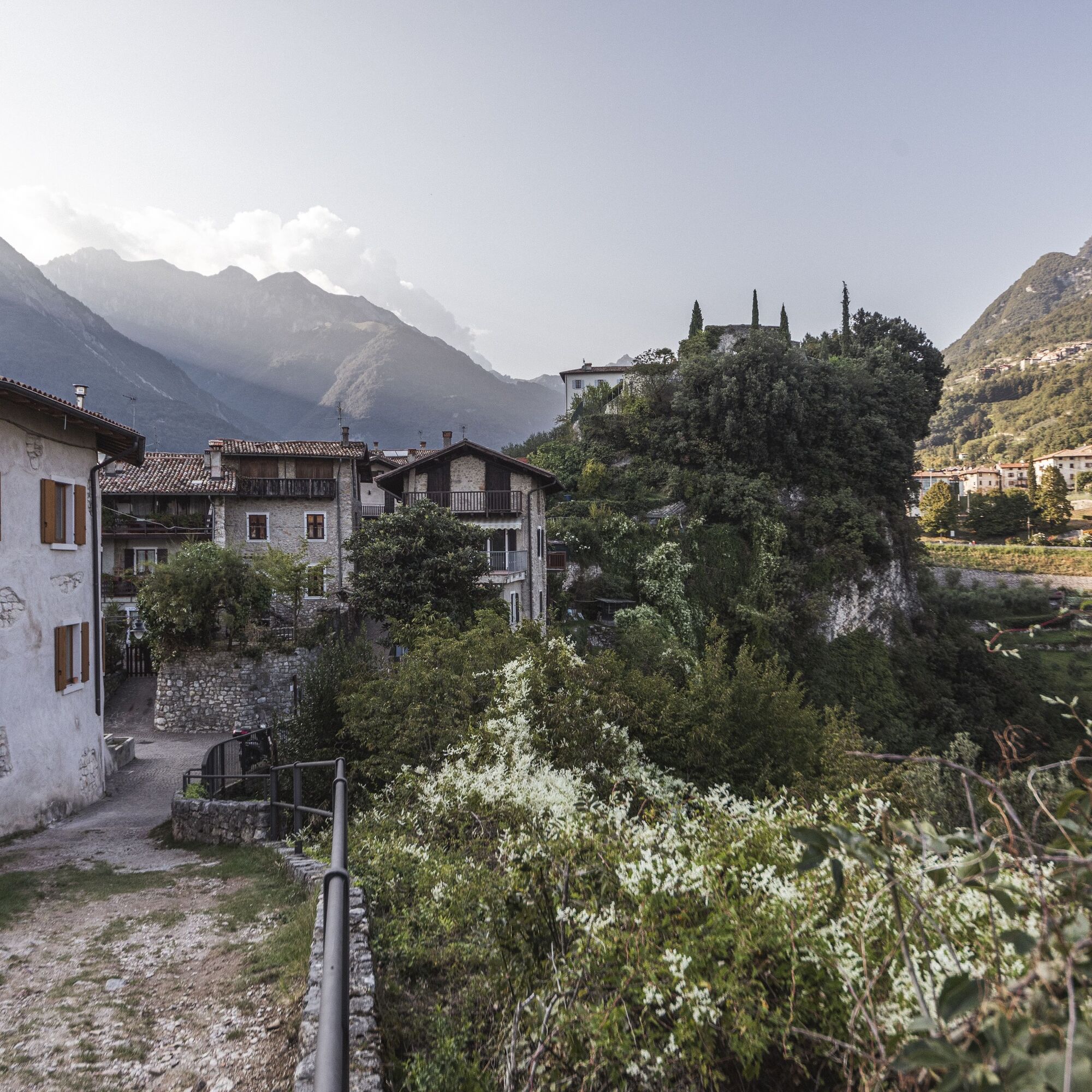 The starting point of the tour is at the car park along the main road in Tenno. From here we follow the main road towards the castle and turn left into Via Gioacchino Prati. We ride through the village and past the square and meet the main road again at a bend.