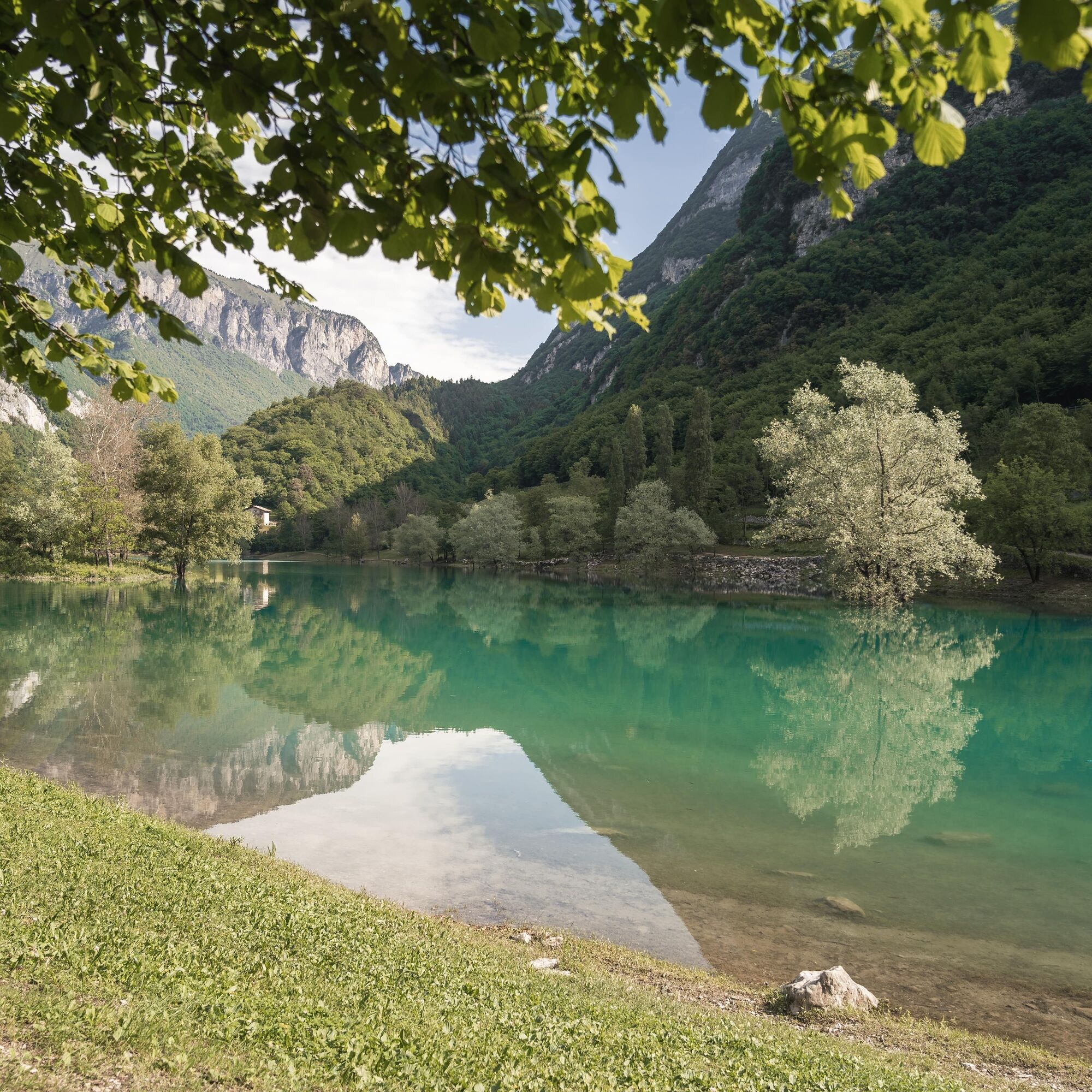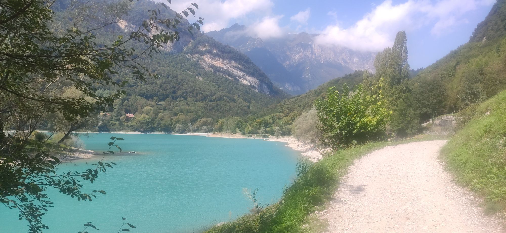 The tour leads through Canale to the village square, where we keep to the right to take the first paved and then gravel path towards Lake Tenno. At the fork, we keep right and continue along the Laghisoli forest road, which runs high above Lake Tenno.
